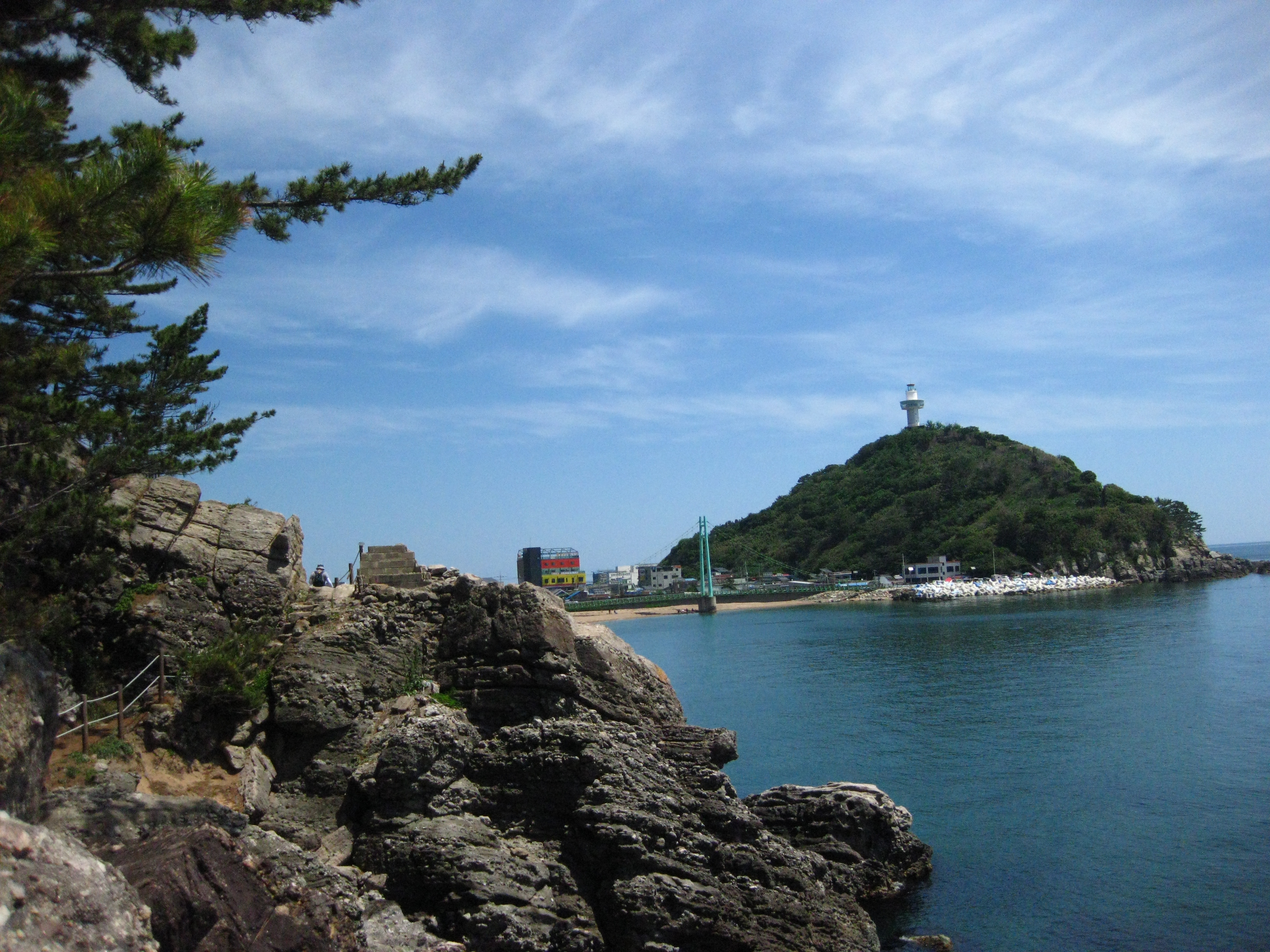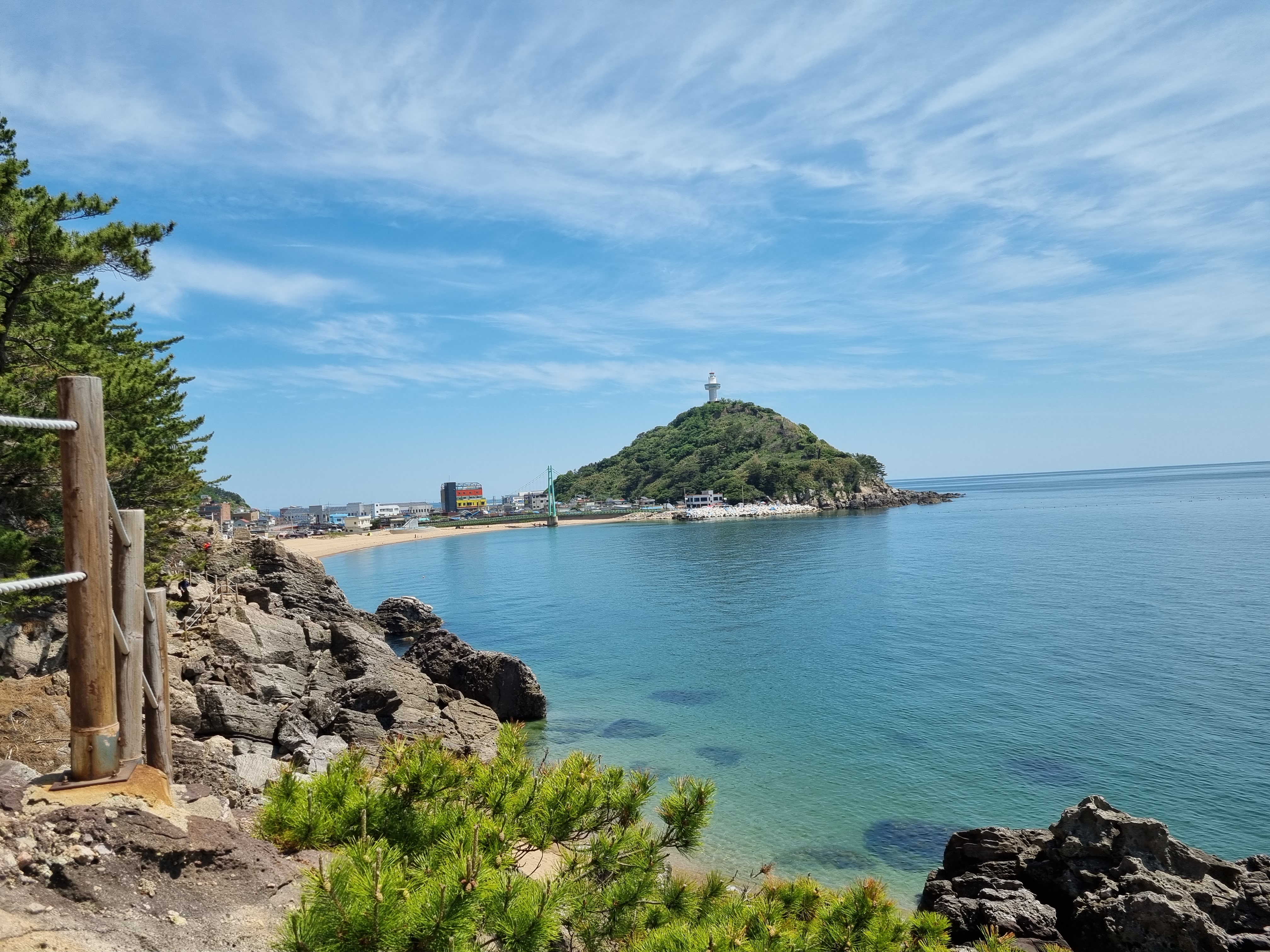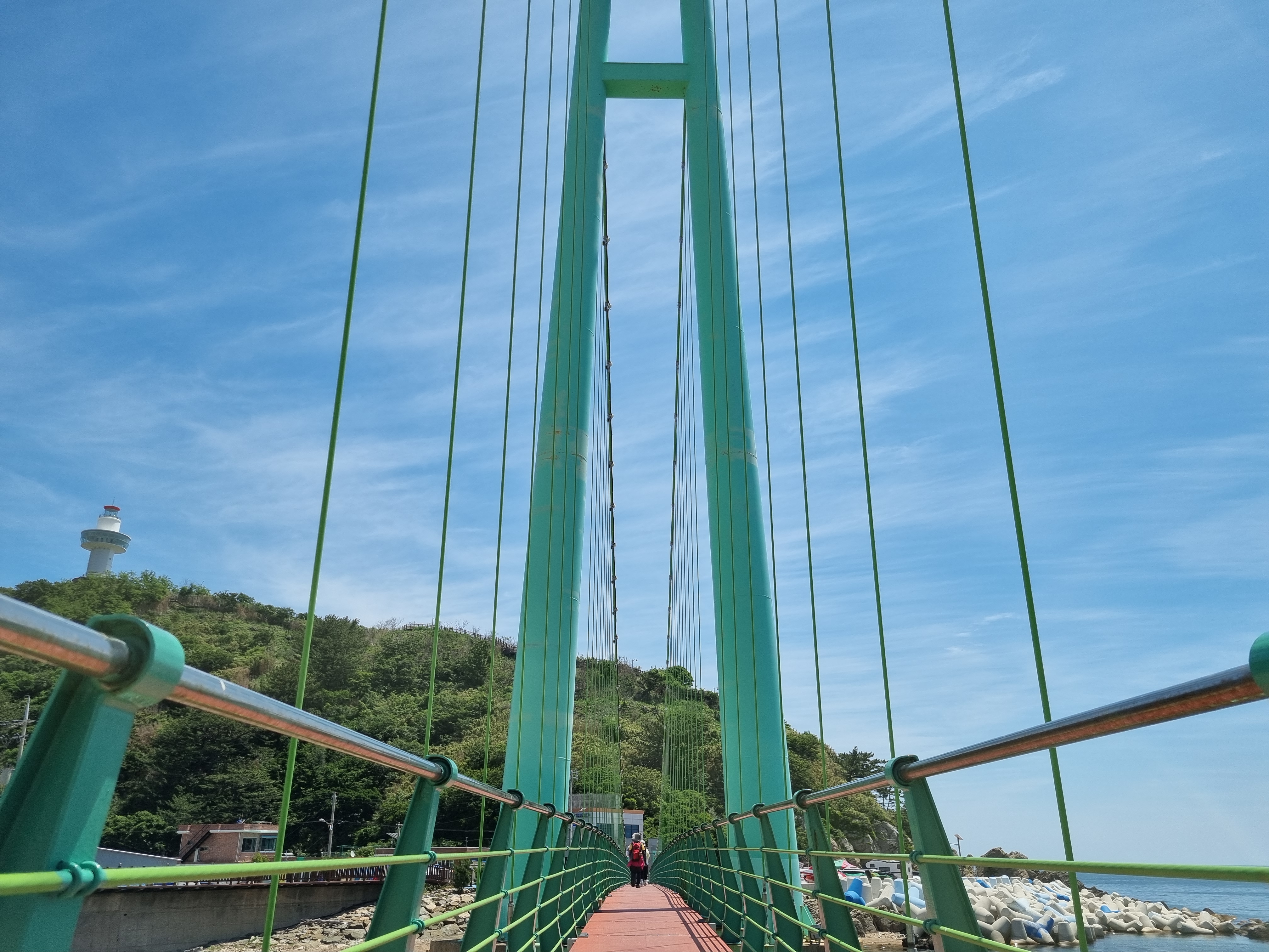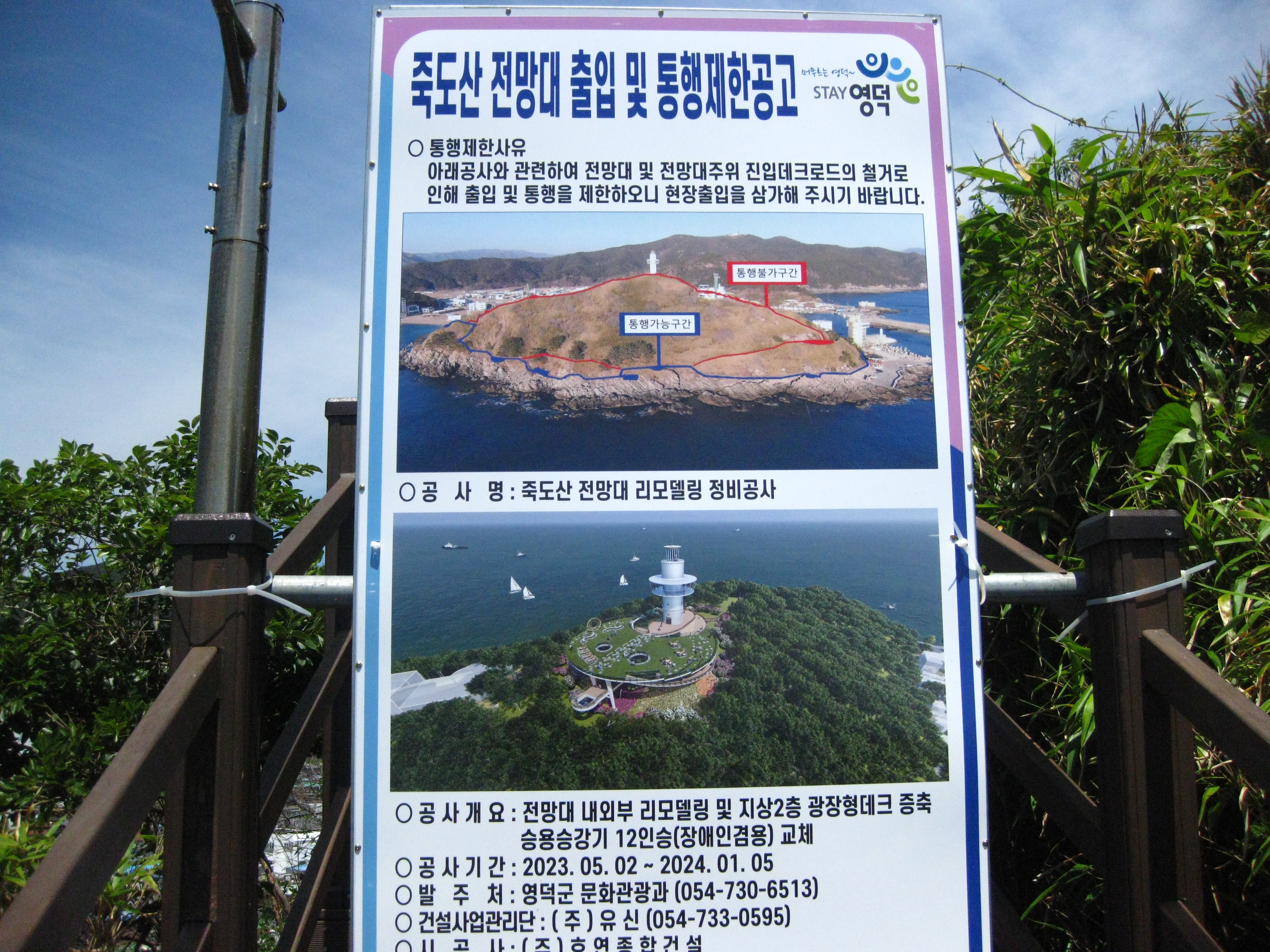 21코스의 종점인 축산항이 가까워지면 육지와 연결되어 있는 죽도로 들어가는 죽도산 블루로드 현수교를 건넌다. 죽도산 꼭대기에 있는 전망대는 리모델링 공사중이라 출입이 통제되고 있었다. 전망대롤 못 올라간 것은 아쉬웠지만 죽도 둘레길을 따라 걸으며 힐링할 수 있어서 좋았다. 21코스 종점인 축산항에 도착하여 노란색 축산리 버스정류장 부스와 축산택시 컨테이너 사이에 숨어(?) 있는 22코스 스탬프를 찍고 22코스 트레킹을 새로 시작한다.