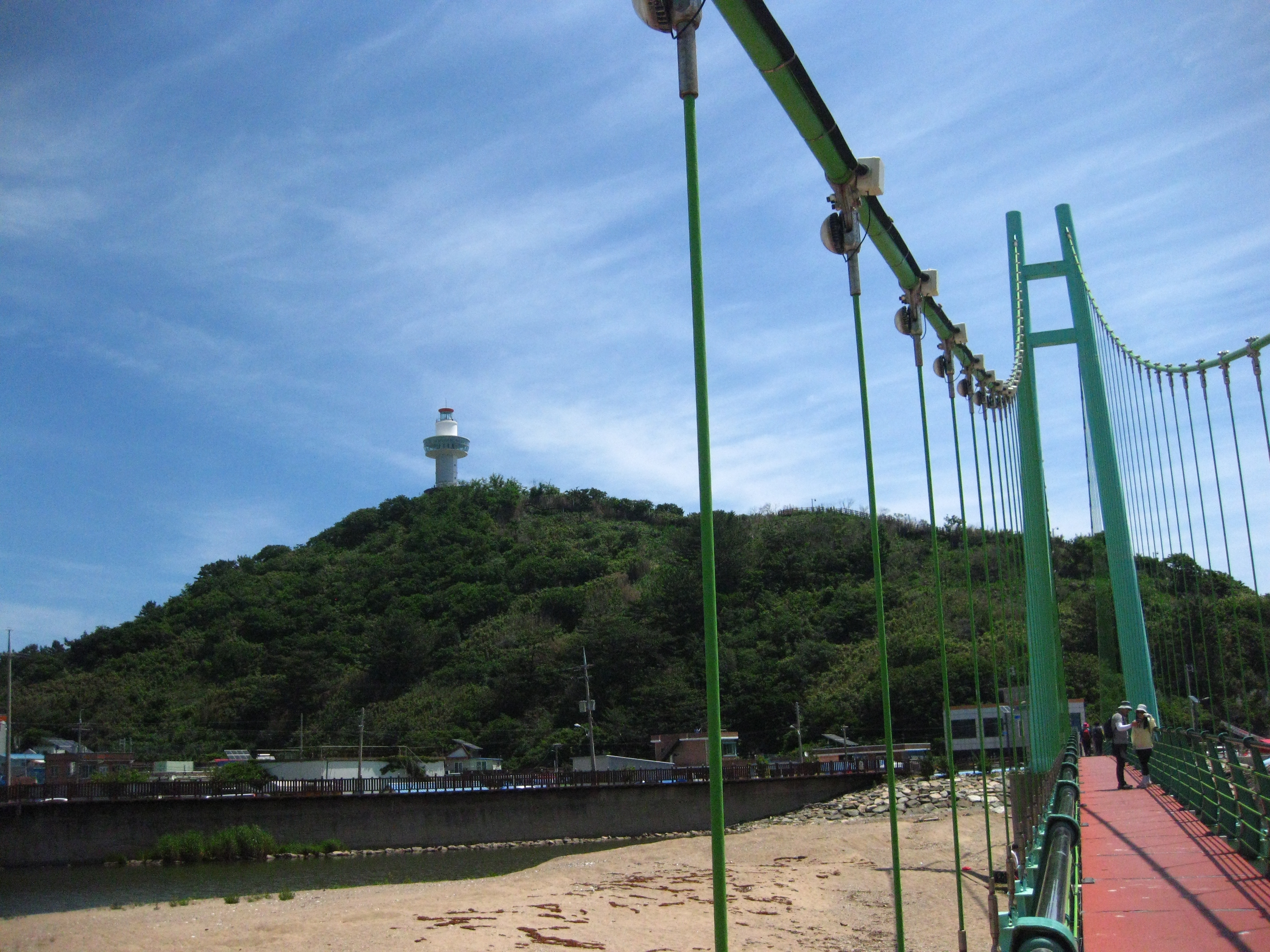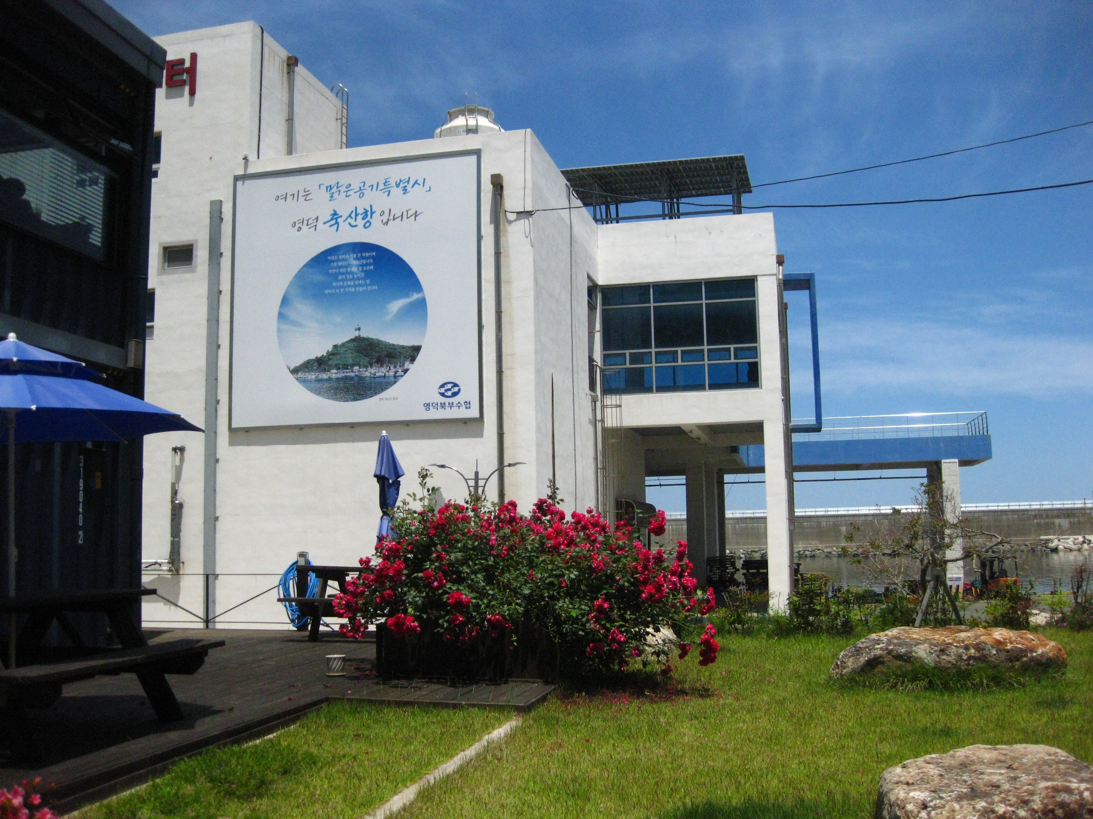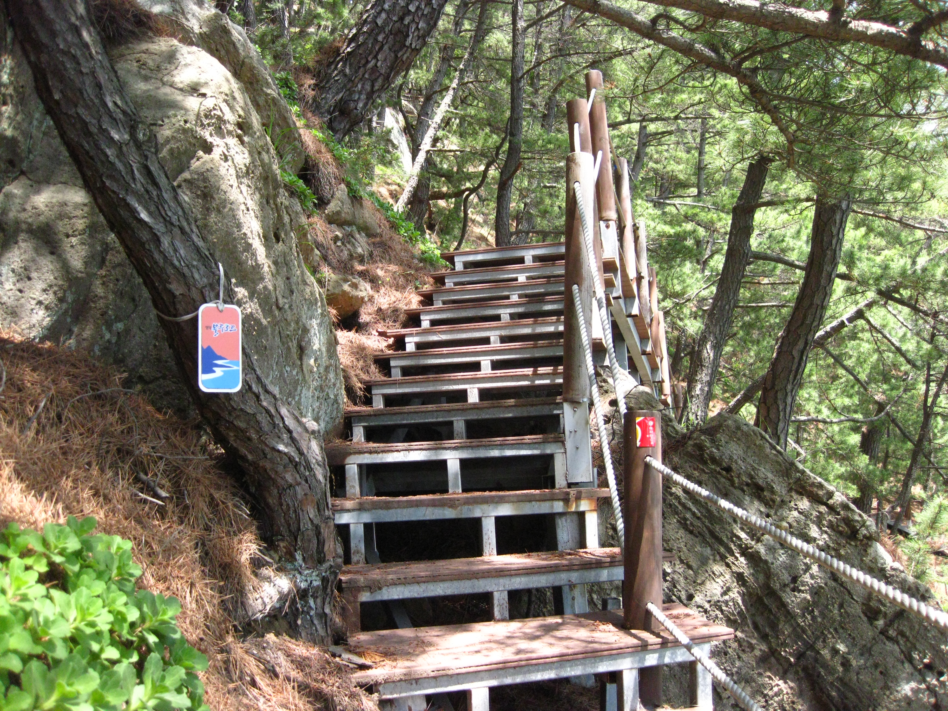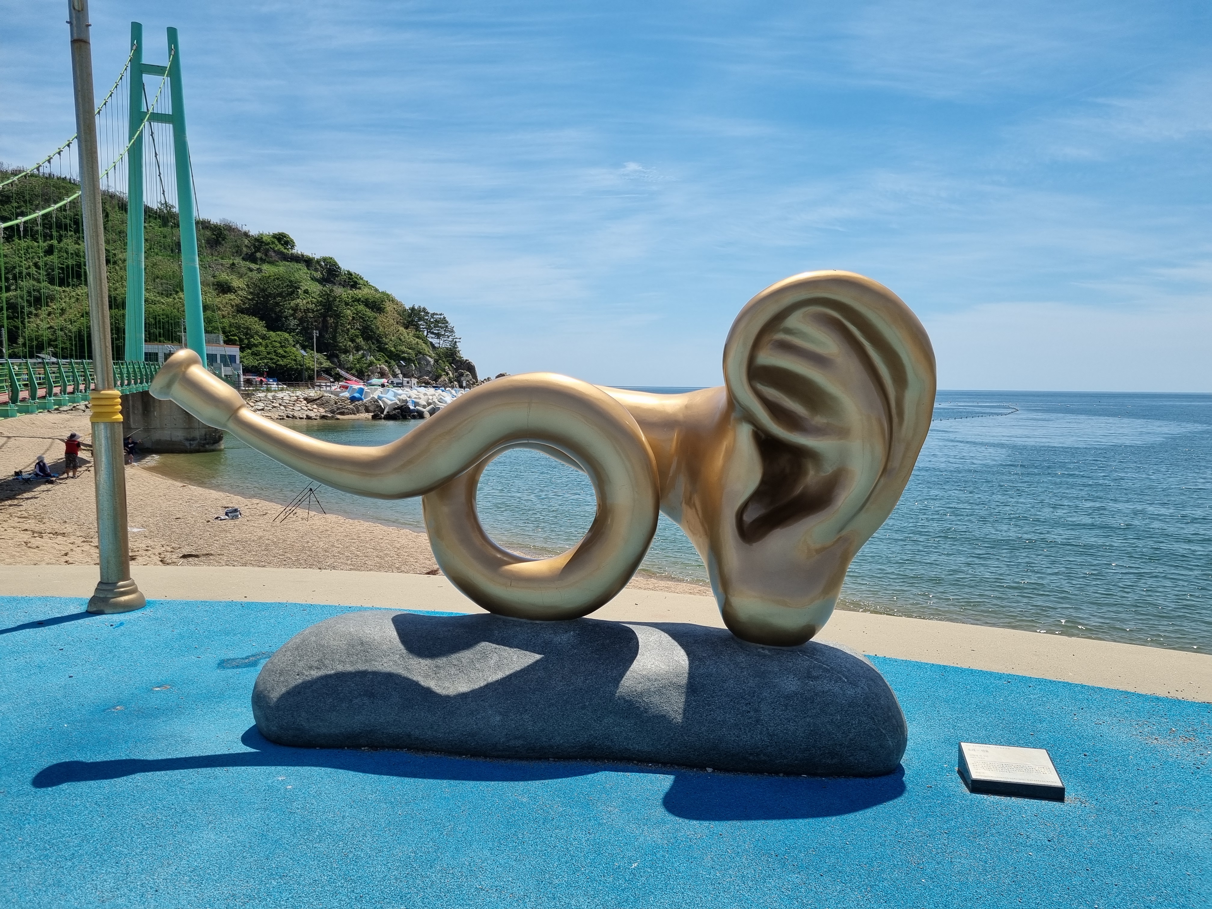 21코스의 종점인 축산항이 가까워지면 육지와 연결되어 있는 죽도로 들어가는 죽도산 블루로드 현수교를 건넌다. 죽도산 꼭대기에 있는 전망대는 리모델링 공사중이라 출입이 통제되고 있었다. 전망대롤 못 올라간 것은 아쉬웠지만 죽도 둘레길을 따라 걸으며 힐링할 수 있어서 좋았다. 21코스 종점인 축산항에 도착하여 노란색 축산리 버스정류장 부스와 축산택시 컨테이너 사이에 숨어(?) 있는 22코스 스탬프를 찍고 22코스 트레킹을 새로 시작한다.