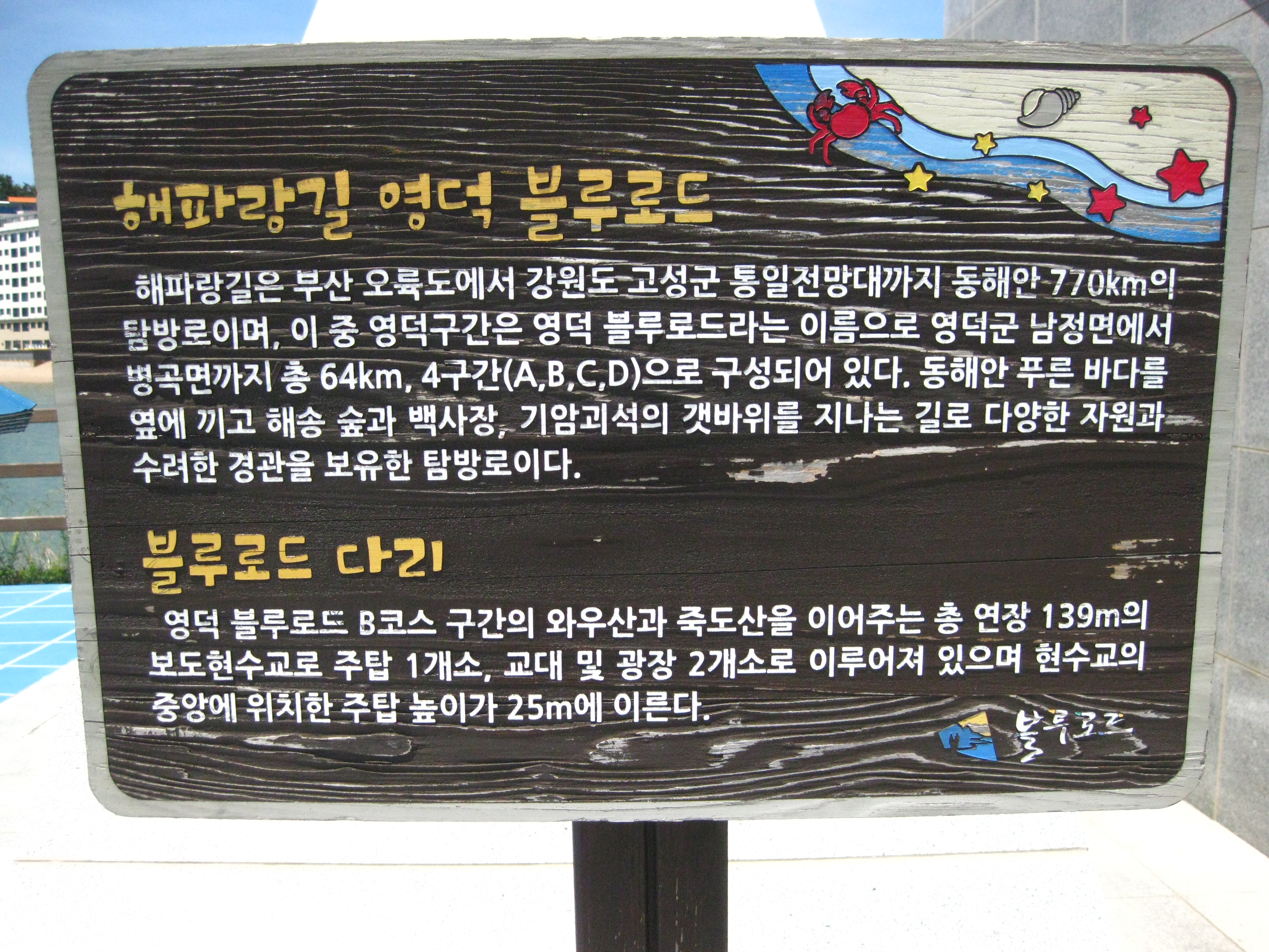 - 경정1리 마을회관/경정해변(10:15) -> 영덕대게로(20번 지방도로)에서 해뱐길 진입(10:28) -> 경정2리 입구/대게 원조마을 기념비(10:32) -> 경정2리 마을회관(10:39) -> 암벽등반절벽(11:04) -> 죽도산 블루로드 현수교(11:15) -> 죽도산 전망대와 축산 등대는 출입금지/죽도 둘레길 전망대(11:25)/점심식사후 출발(11:46) -> 축산3리회관(11:39) -> 축산리 버스정류장(12:05)/스탬프 찍는 곳: 축산리 버스정류장과 축산택시 컨테이너 사이