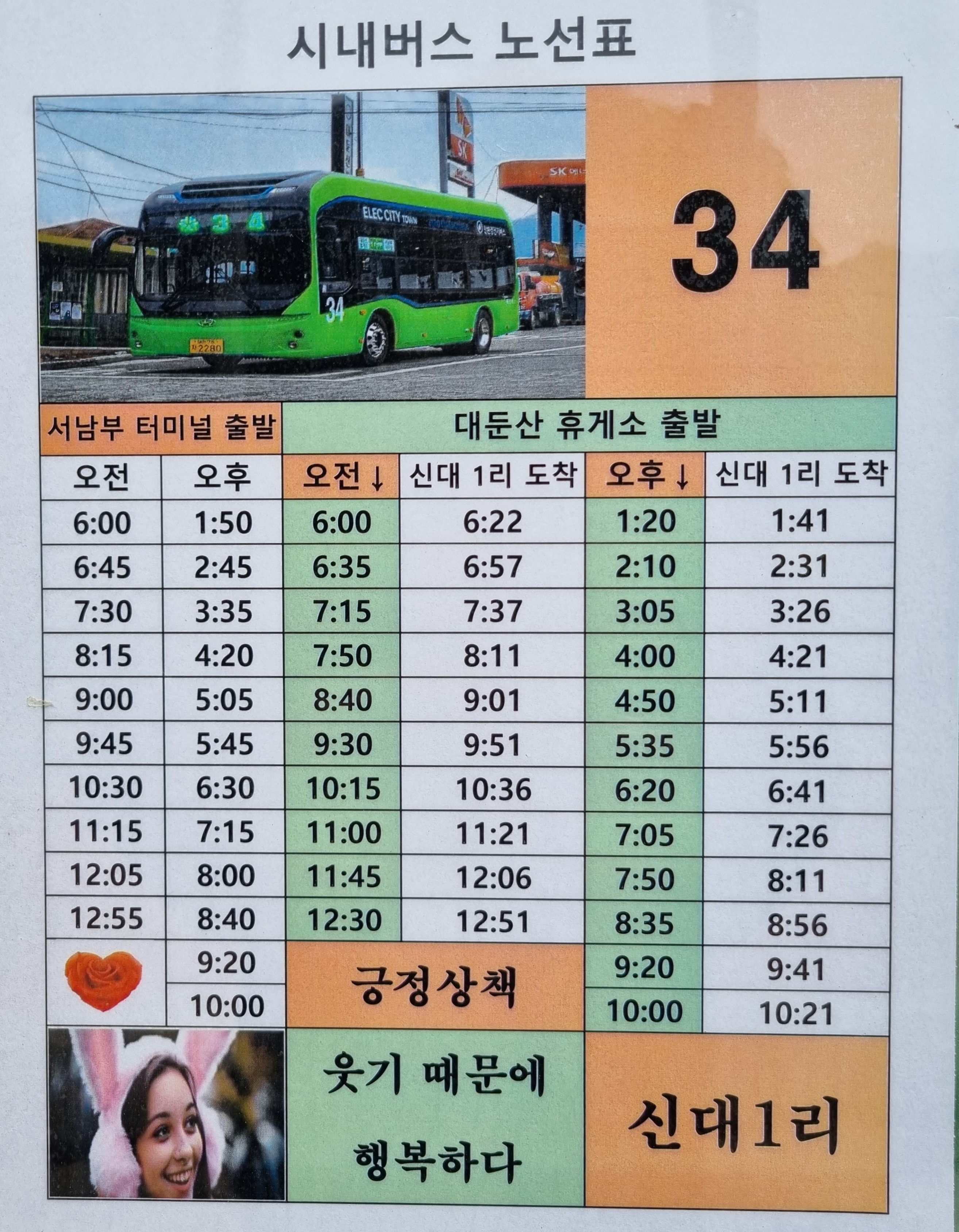 덕택에 서남부버스터미널에서 대둔산휴게소까지 왕복하는 34번 시내버스를 알게 되었다. 다음에는 안영동으로 지나 금산군과의 경계인 샛고개에서 출발하여 거꾸로 5구간을 답사해야겠다. 샛고개에서 출발하는 코스는 대전둘레산 코스와 중복되는 곳이라 뿌리공원 뒤 쯤에서 천비산으로 향하는 시경계걷기 길과 대전둘레산길이 갈라질 듯하다.