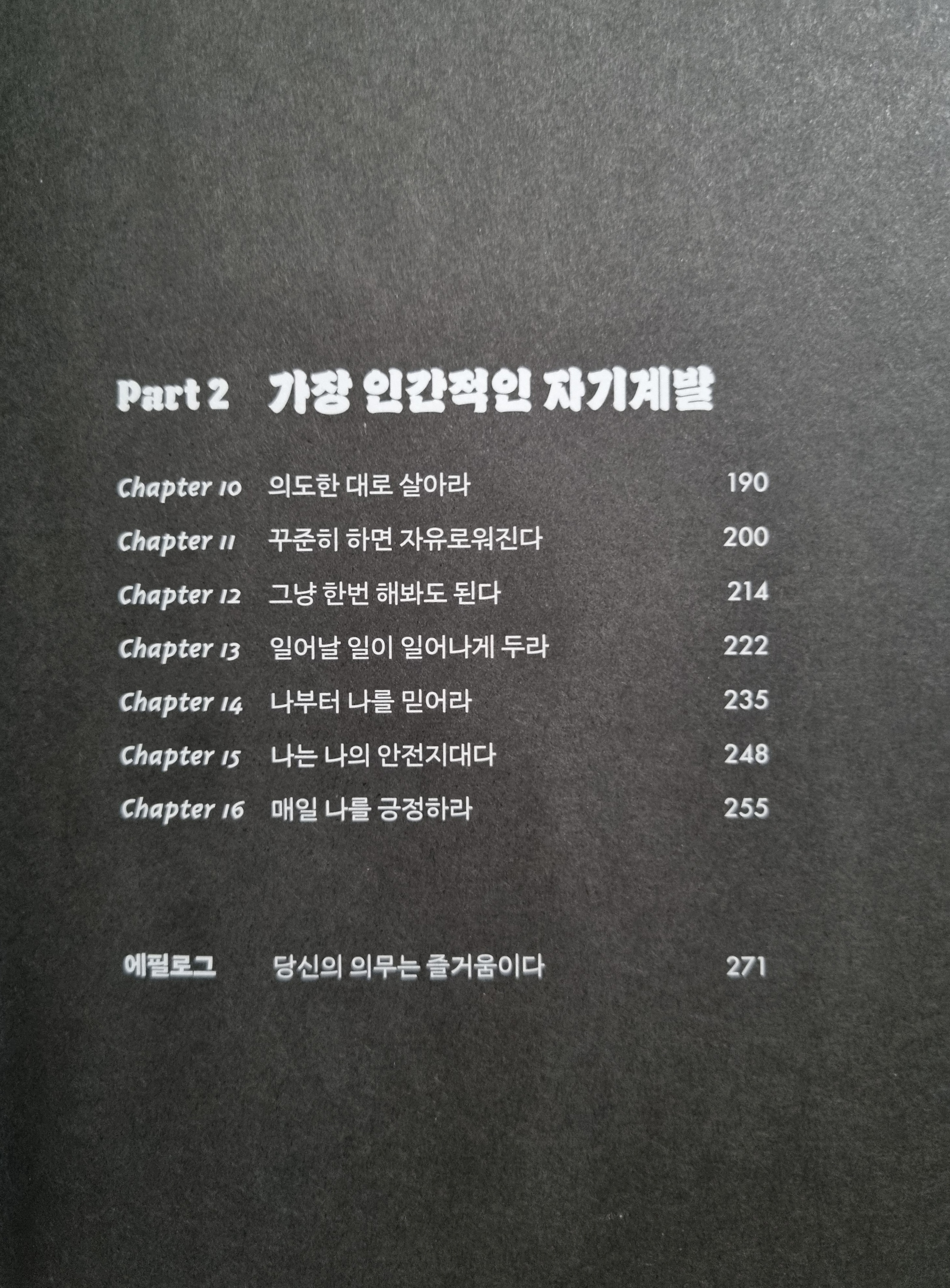 이 책은 Part 1과 Part 2로 구성되어 있다. 나를 고장낸 자기계발이라는 제목의 Part 1에서는 우리가 그동안 가정에서, 학교에서, 사회에서 학습된 개념 중에서 “우리가 지워내야 할 가장 중요한 개념”을 제시하고 있다. 목차에서도 볼 수 있듯이 언뜻보면 우리가 지켜야 할 덕목처럼 보이는 것을 저자는 버리라고 한다. 이 개념들을 잊는 것만으로도 삶의 질이 급격하게 상승할 것이라고 말한다. 배운 것을 계속 지워가다보면 삶이 당신을 놀라운 곳으로 이끌지 모른다고 말한다.