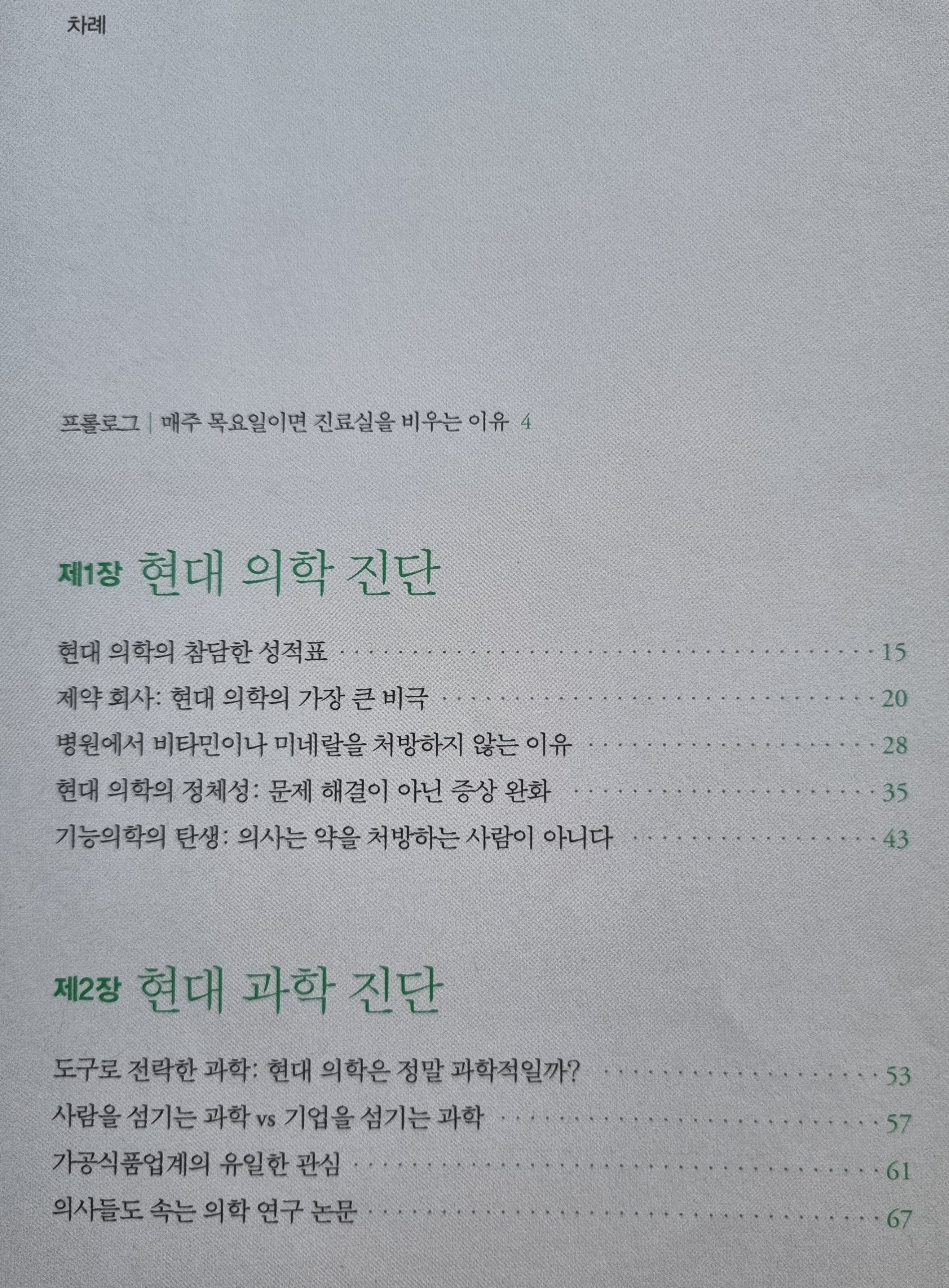 저자는 제1장을 열면서 현대의학이 인간의 건강에서 놓치고 있는 관점들을 피력하고 있다. 물론 서양의학을 말한다. 스트레스와 스트레스가 생체 활동 및 면역에 미치는 악영향, 운동 부족, 영양소 결핍, 화학물질에 범벅이 된 변형된 토양에서 자란 채소와 과일, 식품첨가물과 가공식품, 셀 수없이 많은 환경호르몬을 꼽고 있다. 제약회사가 주도하고 있는 과학에 그저 끌려다니고 있기 때문에 ‘예방’은 돈이 안 되지만, 의료는 ‘산업’이기 때문에 많은 문제를 발생시키고 있다고 주장한다. 그러면서 제약회사와 의료계가 틀어쥐고 있는 의료권력이 환자들에게 넘어와야 한다고 주장하면서 그것이 이 책의 제목인 ‘환자혁명’이라고 말한다.