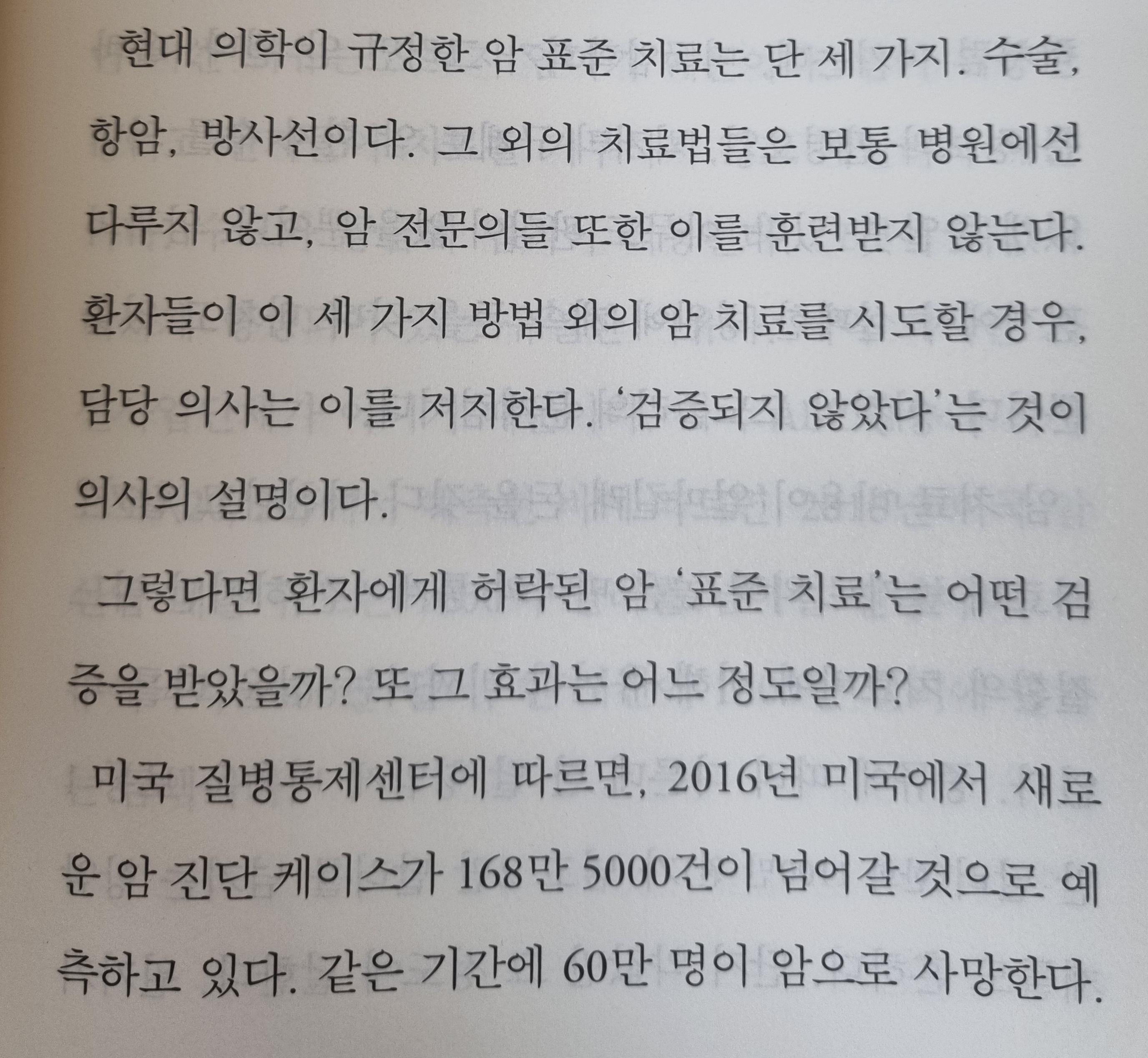 끝으로 제6장은 환자혁명이라는 장의 제목하에서 비만과 암, 장점막 누수증후군, 자가면역과 아토피, 항생제, 백신에 대해 소개하고 있다. 이 책을 읽으며 가장 마음에 와닿은 것은 암에 대한 설명이다. 저자는 ‘암은 사형선고가 아니고 몸의 경고 신호’라고 말하며, 암은 만성질환이 아니고 대사질환이라고 말한다. 암이 발견된다고 응급상황이 아니다. 그러니 환자는 스스로 시간을 두고 관심을 갖고 연구를 시작해야 좋은 결과를 기대할 수 있다고 말한다. 암 진단을 받으면 사형선고를 받은 것처럼 인식하는 현실은 꼭 없어야할 것 같다.