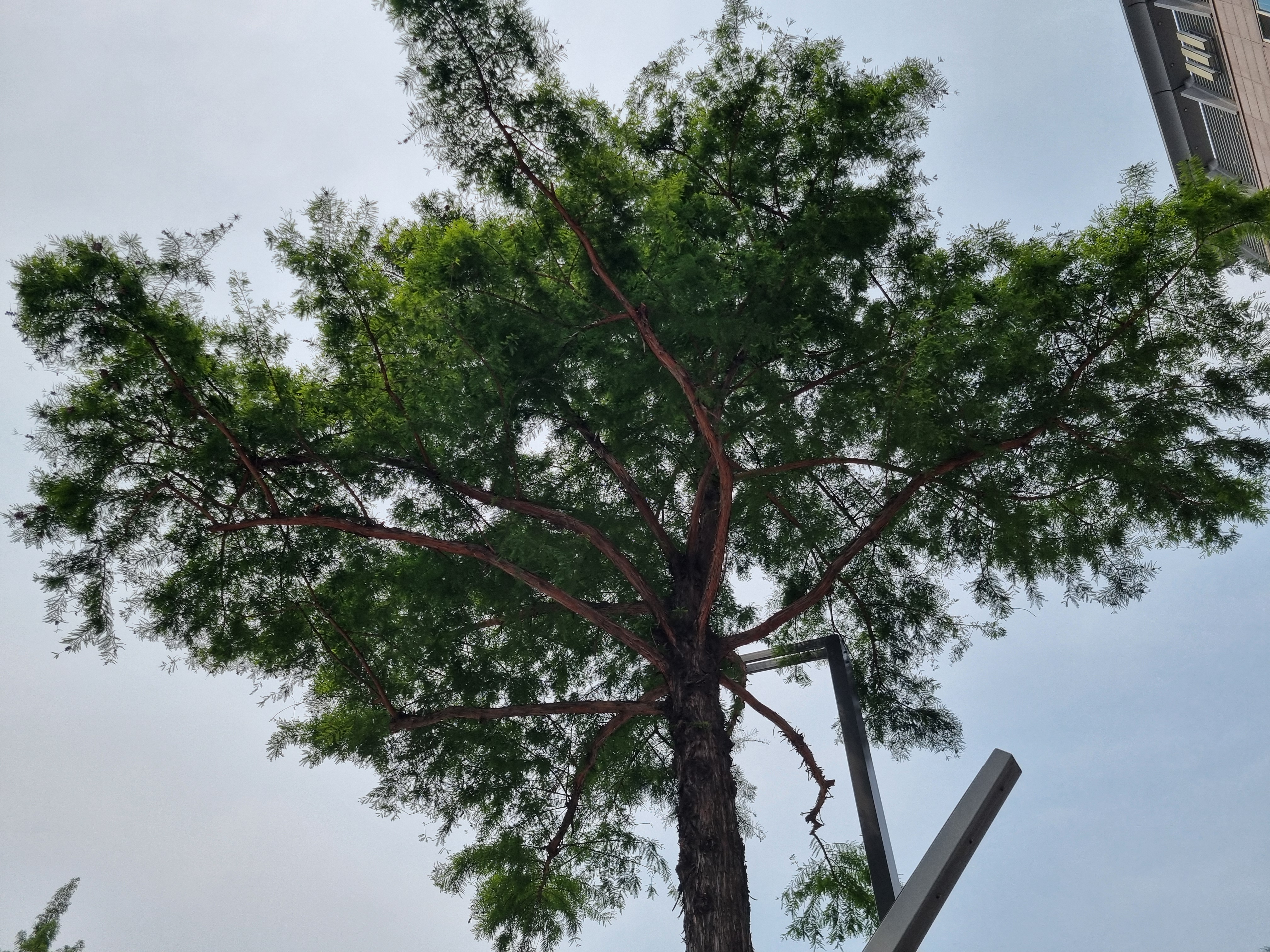 2025년 5월 31일에 대전광역시 유성구 유성온천역 7번 출구에서 담았다. 대전광역시 도시철도 유성온천역에서 충남대학교 정문까지는 가로수로 메타세쿼이아가 심어져 있는데, 이곳 유성온천역 7번 출구 시내버스 정류장 근처에는 낙우송이 서너 그루 심어져 있다. 언뜻 보면 수형이나 잎이 비슷하여 낙우송과 메타세쿼이아를 구분하기가 쉽지 않다. 우상의 잎이 대생(마주 나기)하는 메타세쿼이아와 달리 낙우송은 우상의 잎이 호생(어긋 나기)하거나 랜덤하게 나기도 한다. 무엇보다는 낙우송은 뿌리 부분에서 유방처럼 땅위로 올라오는 공기뿌리가 발생하는 것이 크게 다르다. 이 시기에는 낙우송 잎이 연한 녹색으로 보인다.