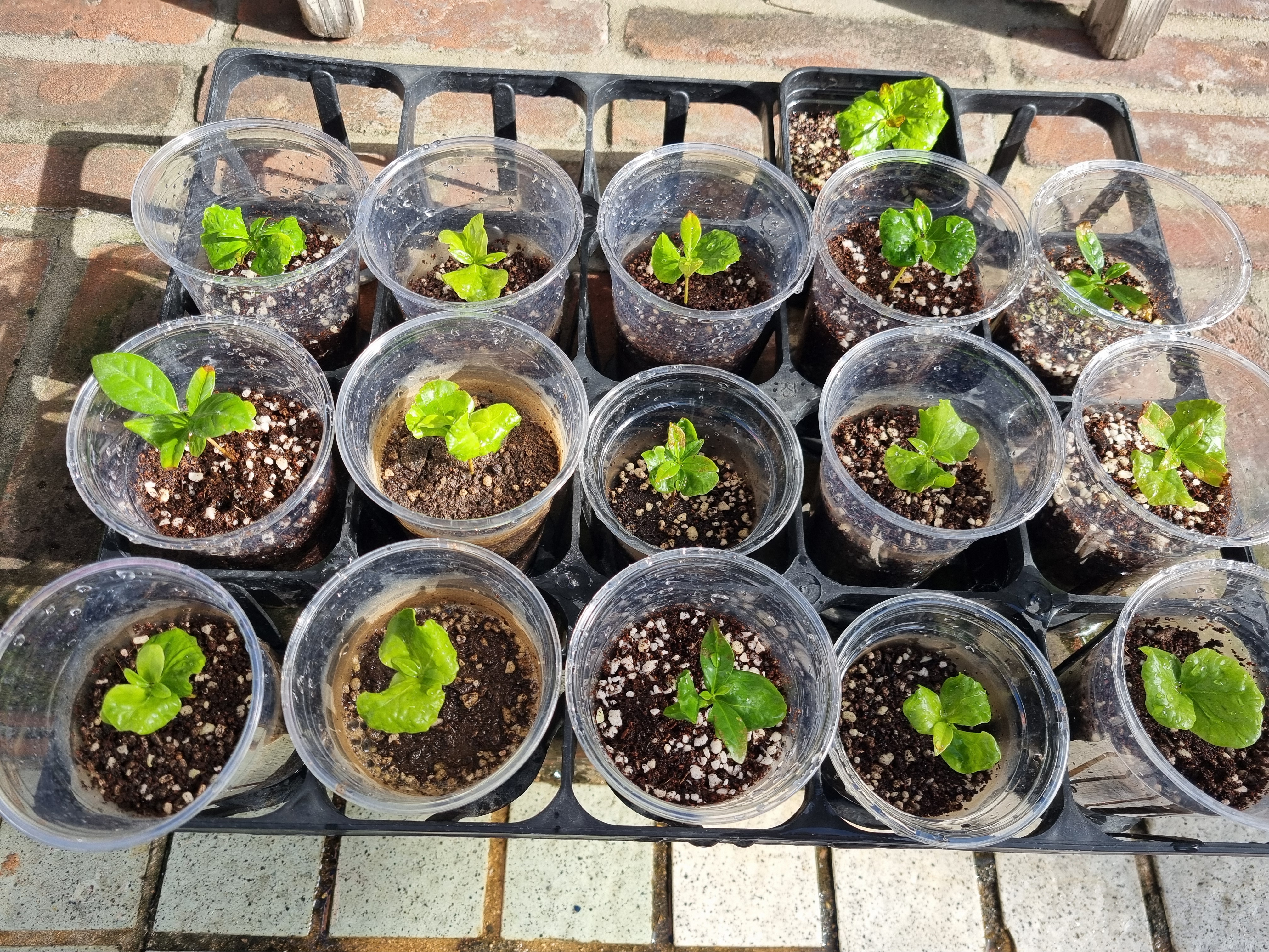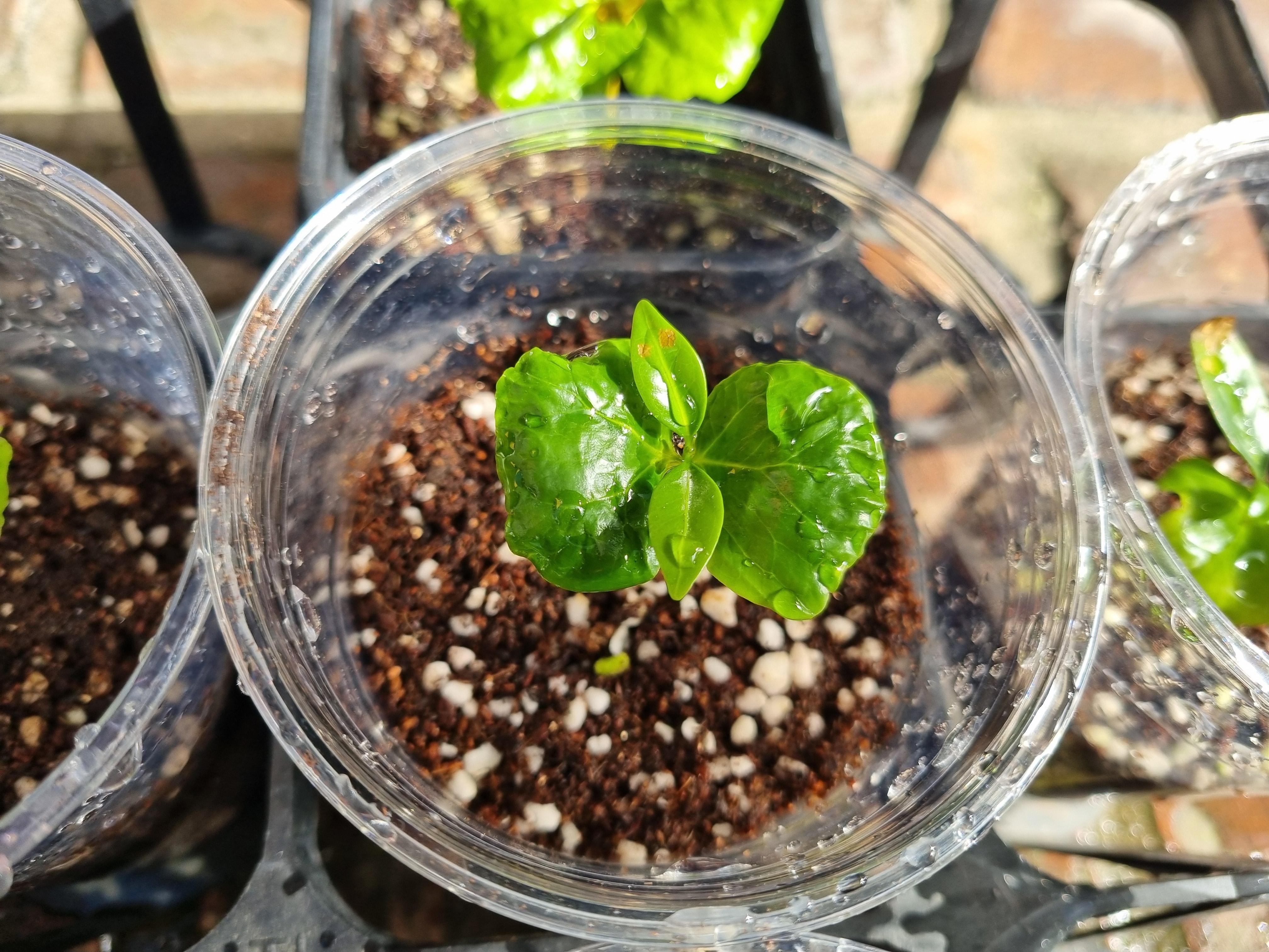 2025년 11월 16일(일) 대전광역시 서구 월평동 작은 카페 앞에서 담았다. 커피를 심어 발아시킨 새싻들이 가을 볕을 쬐러 가게앞에 진열되어 있다. 카페 주인의 정성이 보인다.