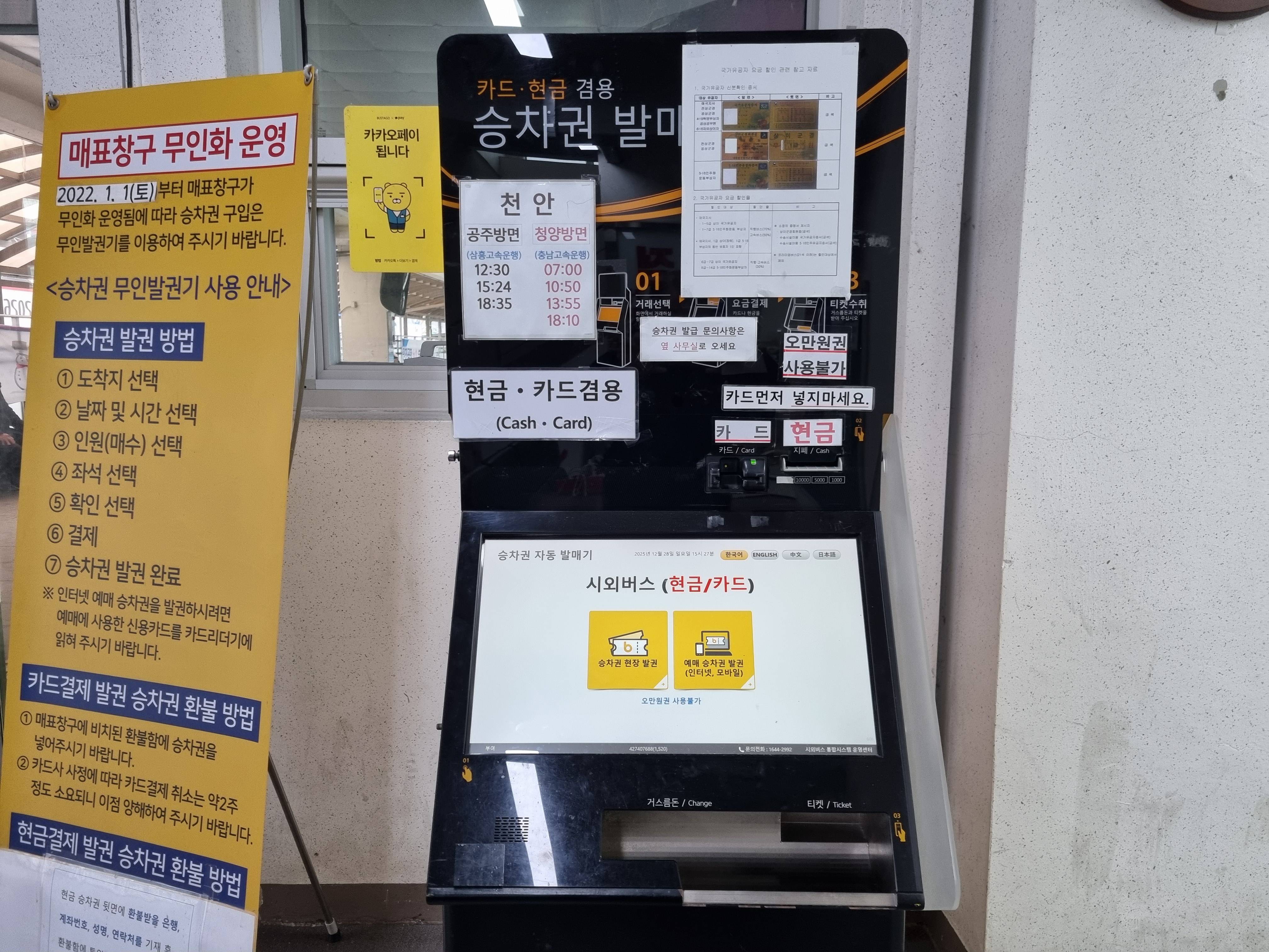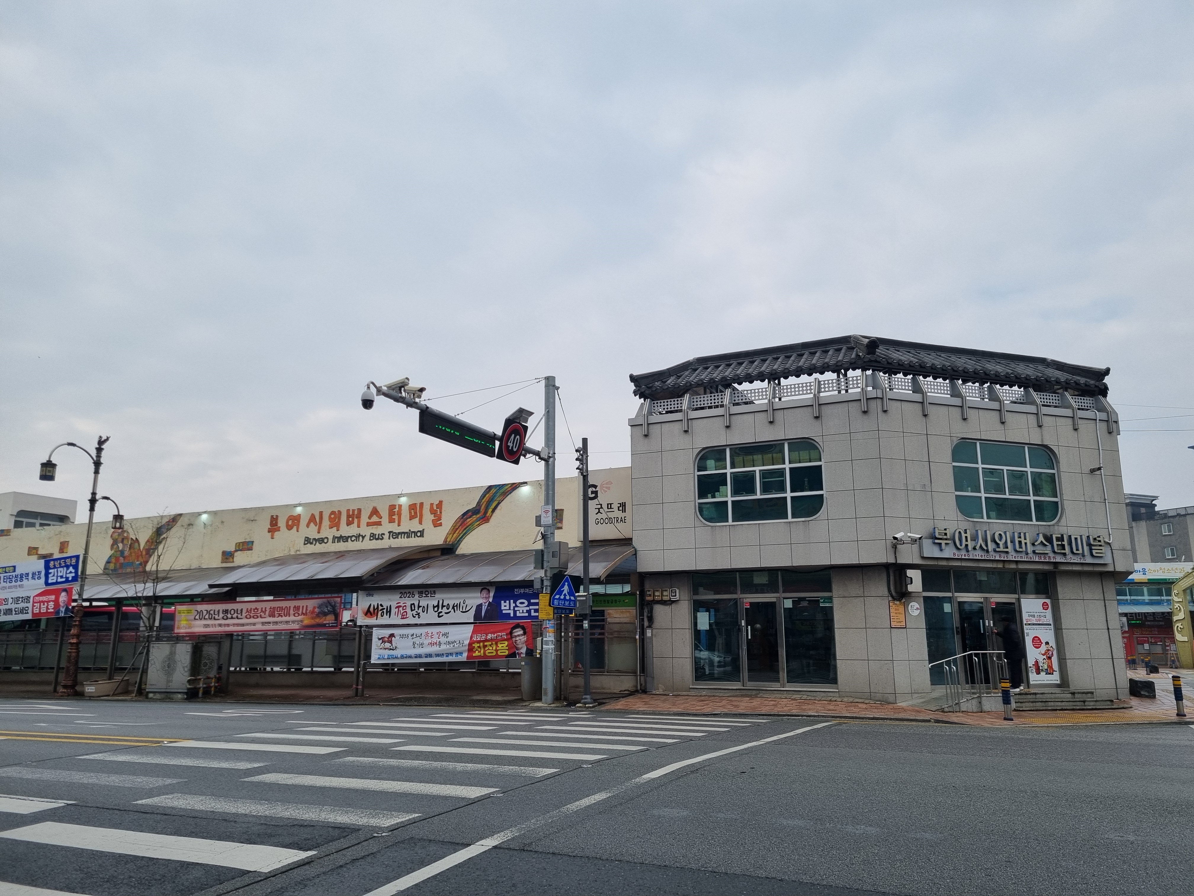 2025년 12월 25일에 국립부여박물관에 가는 길에 충남 부여군 부여읍 사비로 87(부여읍 구아리 324-1)에 있는 부여시외버스 터미널을 담았다. 요즘 대부분의 소도시 시외버스터미널이 그렇지만 매표소 대신 무인발급기가 표를 팔고 있다. 그래도 이곳 부여읍 시외버스터미널은 생각보다 깨끗하고 승차장도 넓다. 서울행 시외버스는 평균 30분마다 출발하는 듯하고, 대전행 시외버스는 평균 한 시간마다 출발하는 버스터미널이라 규모도 제법 크고 주변도 깨끗하다.