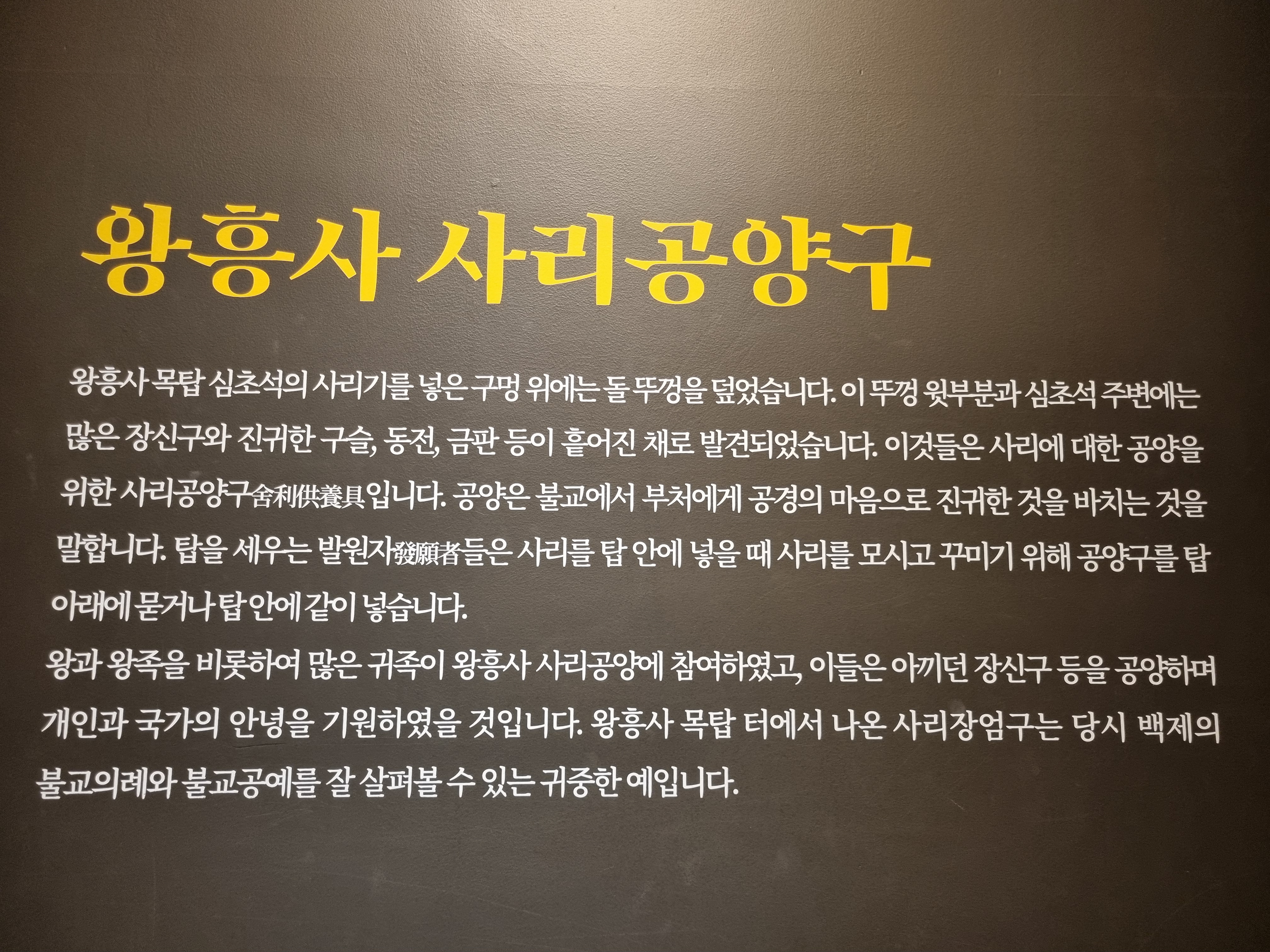 제3전시실 출구 쪽에는 2007년에 발굴되어 보물로 지정되어 있다가 2019년에 국보로 지정된 부여 왕흥사지 출토 사리기(扶餘 王興寺址 出土 舍利器)를 볼 수 있다. 청동제사리합 안에 은제사리호가 들어 있고 다시 그 안에 금제사리병이 있는 구조이다. 전하는 말에 따르면 사리 2개를 넣었는데 나중에 보니 3개로 되어 있었다는 전설이 있는 사리병 안에는 발굴 당시 사리는 없었다고 한다.