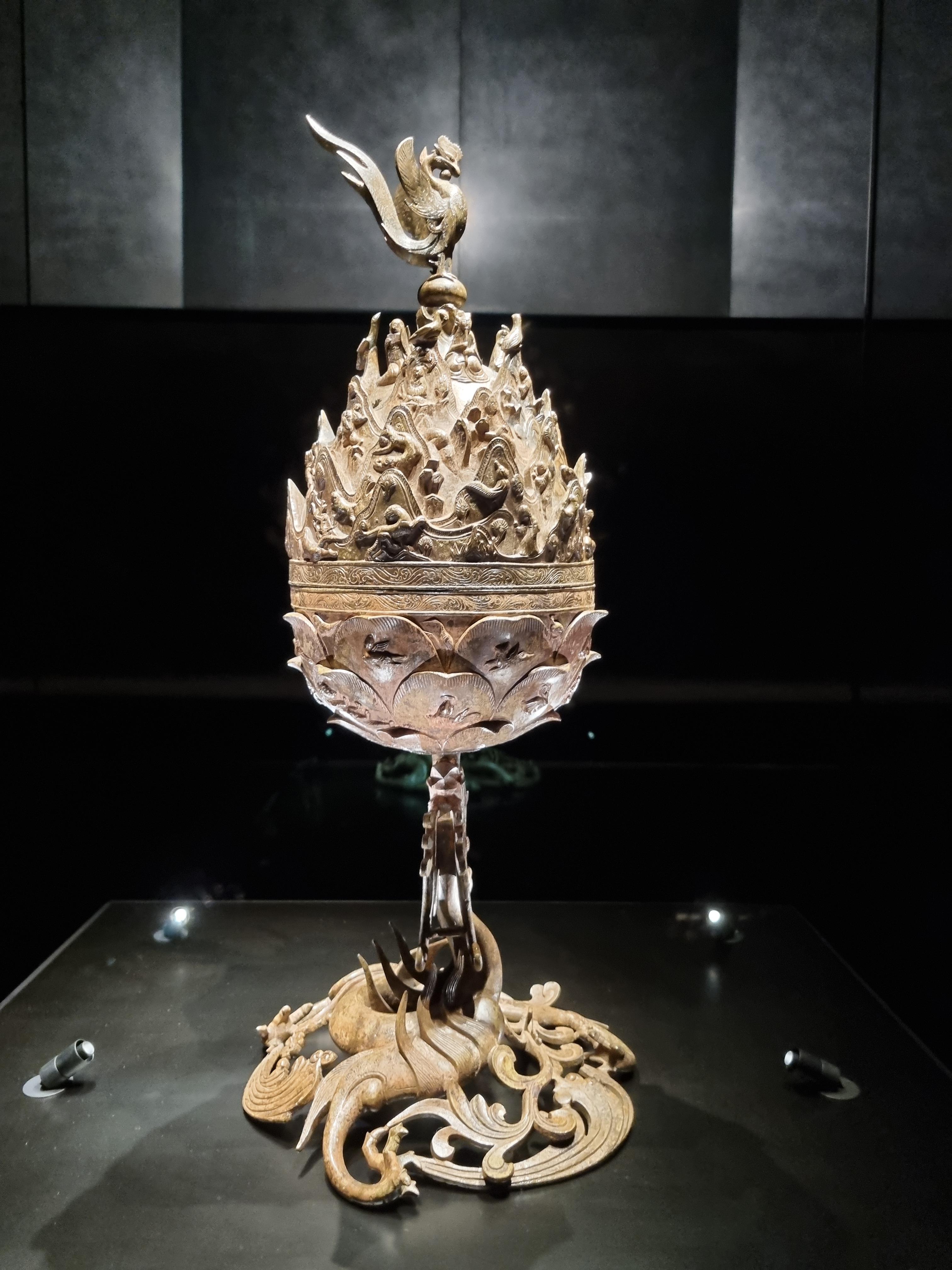 뚜껑 꼭대기에는 별도로 부착된 봉황이 목과 부리로 여의주를 품고 날개를 편 채 힘있게 서 있는데, 길게 약간 치켜 올라간 꼬리의 부드러움은 백제적 특징이라 하겠다. 봉황 앞 가슴과 악사상 앞 뒤에는 2개씩 10개의 구멍이 뚫려 있어 몸체에서 향 연기를 자연스럽게 피어오를 수 있게 하였다. (도슨트님의 설명으로는 악사들 앞의 구멍 5개는 공기를 빨라들이는 구멍이고, 뒤쪽의 5개와 봉황의 앞 가슴에 있는 7개의 구멍에서 연기가 피어 오른다고 한다.)