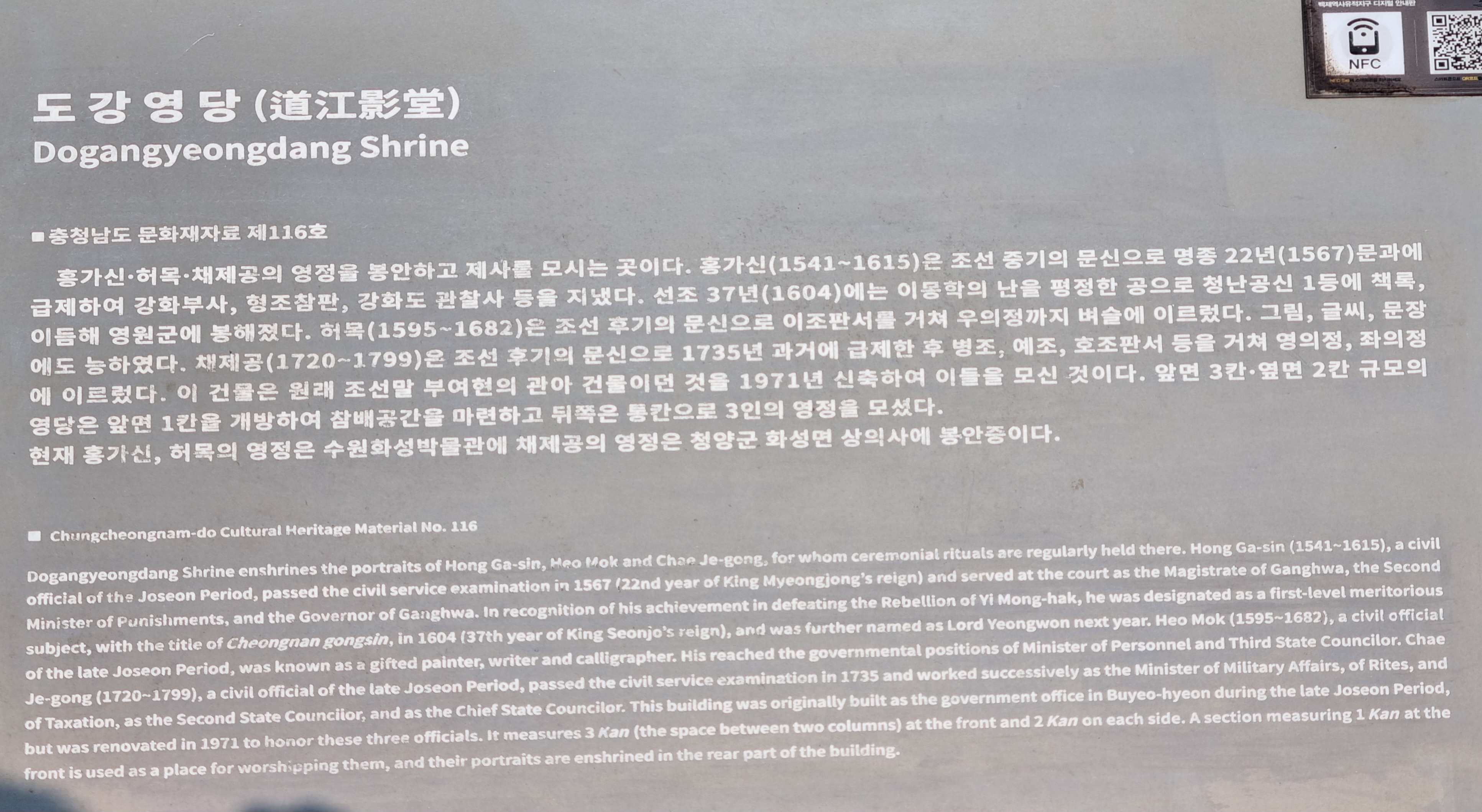허목(1595∼1682)은 조선 후기의 문신으로 과거를 거치지 않고 이조판서를 거쳐 우의정까지 벼슬이 이르렀다. 그림, 글씨, 문장에도 능하였으며 특히 전서에 뛰어나 동방 제1인자라는 찬사를 받았다. 채제공(1720∼1799)은 조선 후기의 문신으로 1735년 과거에 급제한 뒤 관직생활을 시작하였다. 영조의 세자 폐위 문제를 죽음을 무릅쓰고 막았는데, 이로 인해 영조의 신임을 얻게 되었다. 그 후 병조, 예조, 호조판서 등을 거쳐 영의정, 좌의정으로 행정의 최고 책임을 맡기도 하였다. 수원성 건설에도 참여하였으며 『경종내실록』, 『영종실록』, 『국조보감』의 편찬 작업에도 참여하였다.