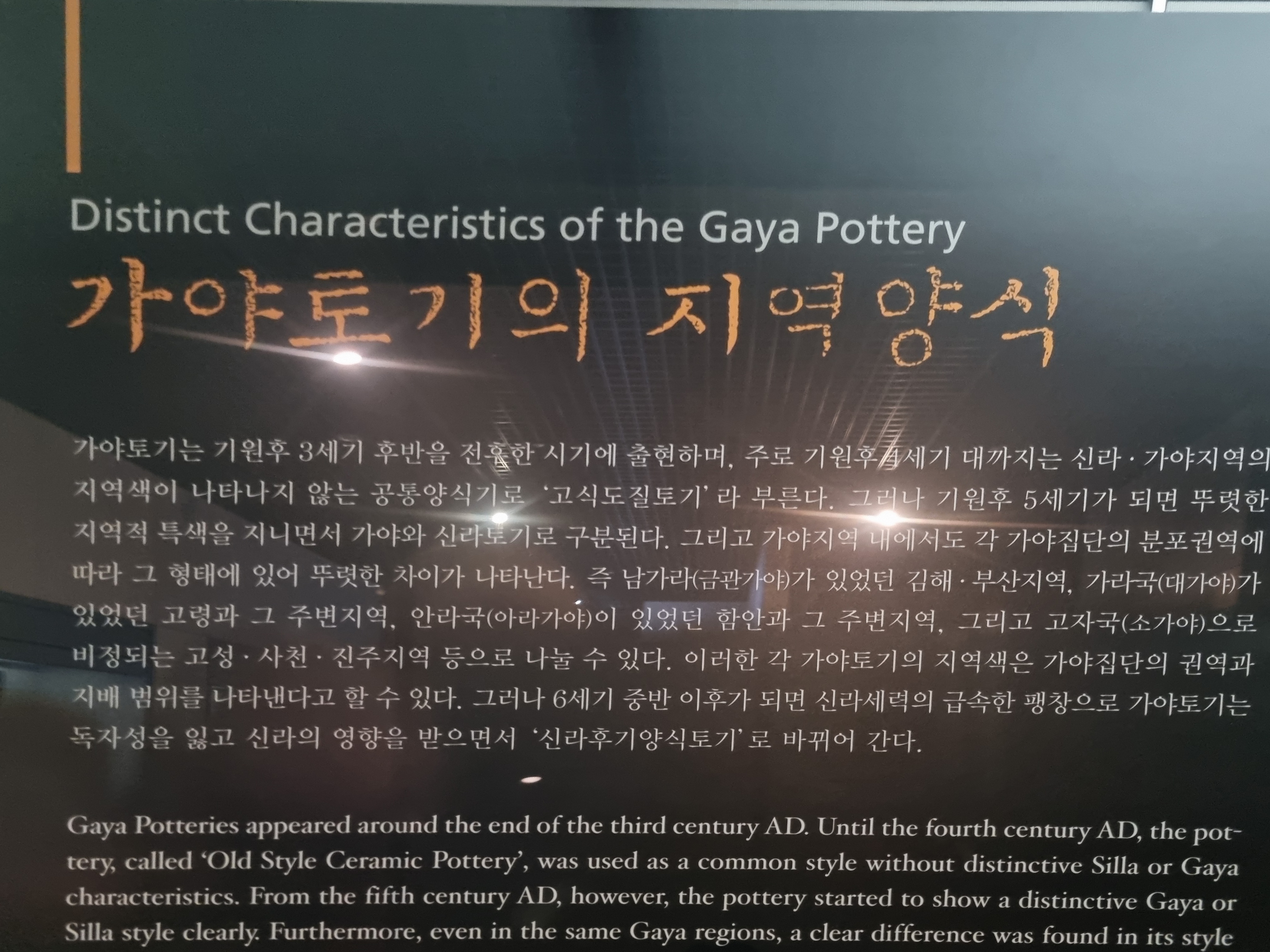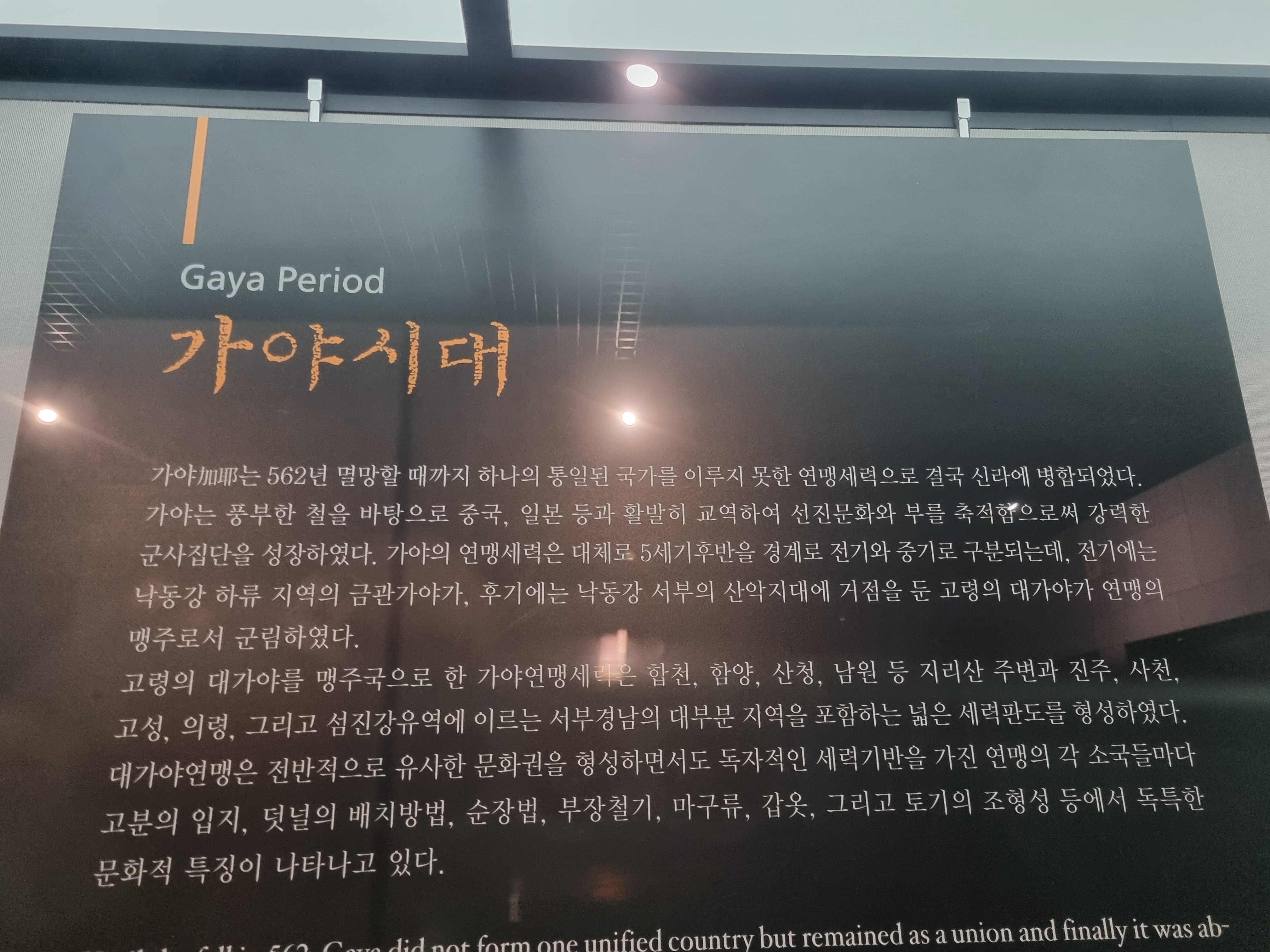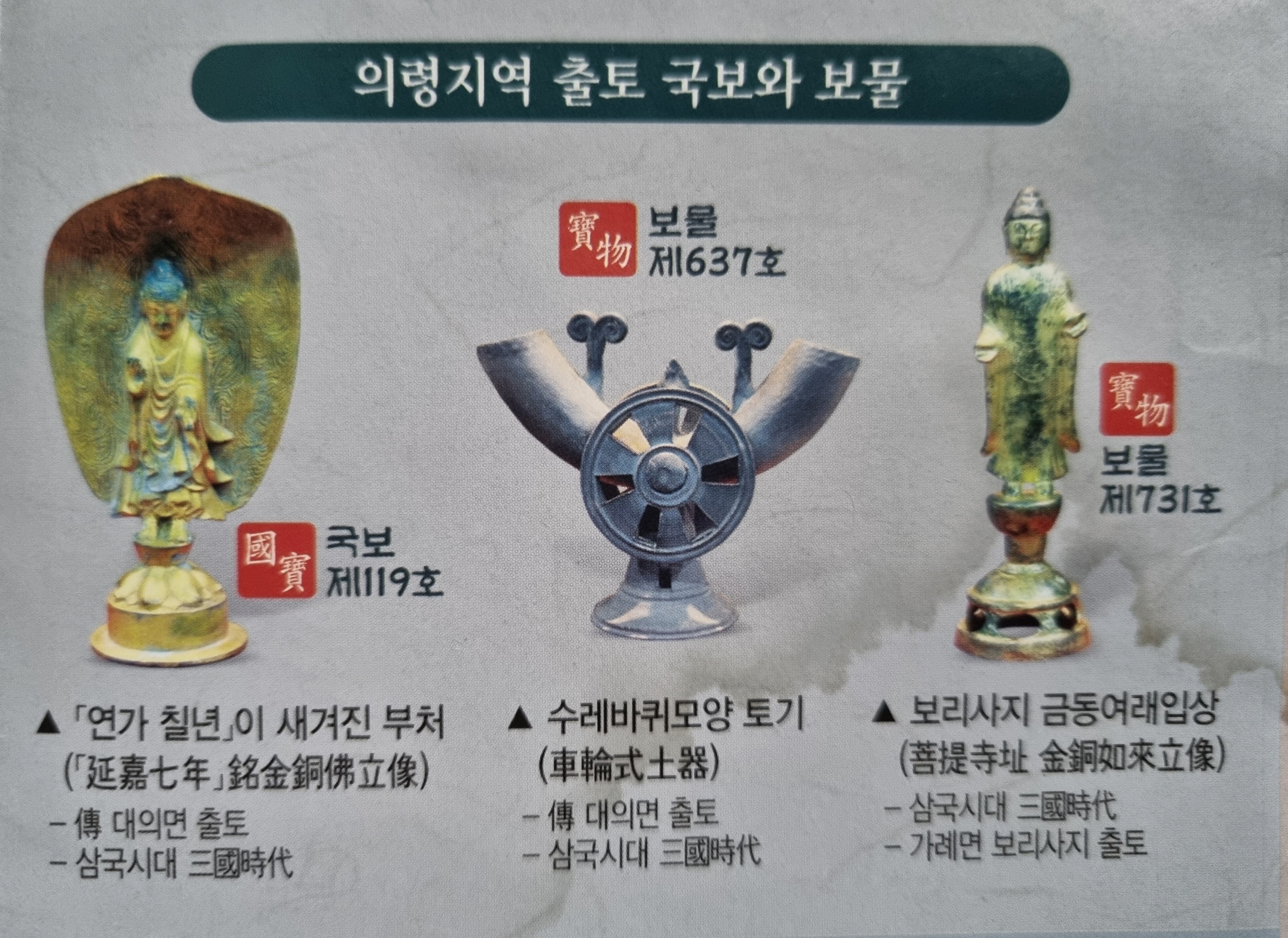가야시대 유물들은 이곳 의병박물관의 특징을 잘 보여 주고 있었다. 이곳 의령지역은 가야시대 초기에는 함안에 있던 아라가야에 속했었고, 그후 김해의 금관가야가 융성할 때는 금관가야의 영역이었으며, 후기 가야연맹 시절에는 경북 고령의 대가야의 영역이었다. 가야 시대 유물로 아라가야, 금관가야, 대가야, 소가야 등 여러 가야국의 특징적인 유물들이 같이 전시되고 있었다. 경남 고성군의 고성박물관에서 보았던 소가야 토기들도 여기서 볼 수 있었다. 철기문화를 꽃 피웠던 가야의 철제 마구(馬具, 말갖춤) 유물들을 볼 수 있다. 의령지역에서 출토된 국보인 연가칠년명금동불입상과 보물로 지정되어 있는 수레바퀴 모양 토기와 보리사지금동여래입상이 별도 코너로 전시되어 있다.