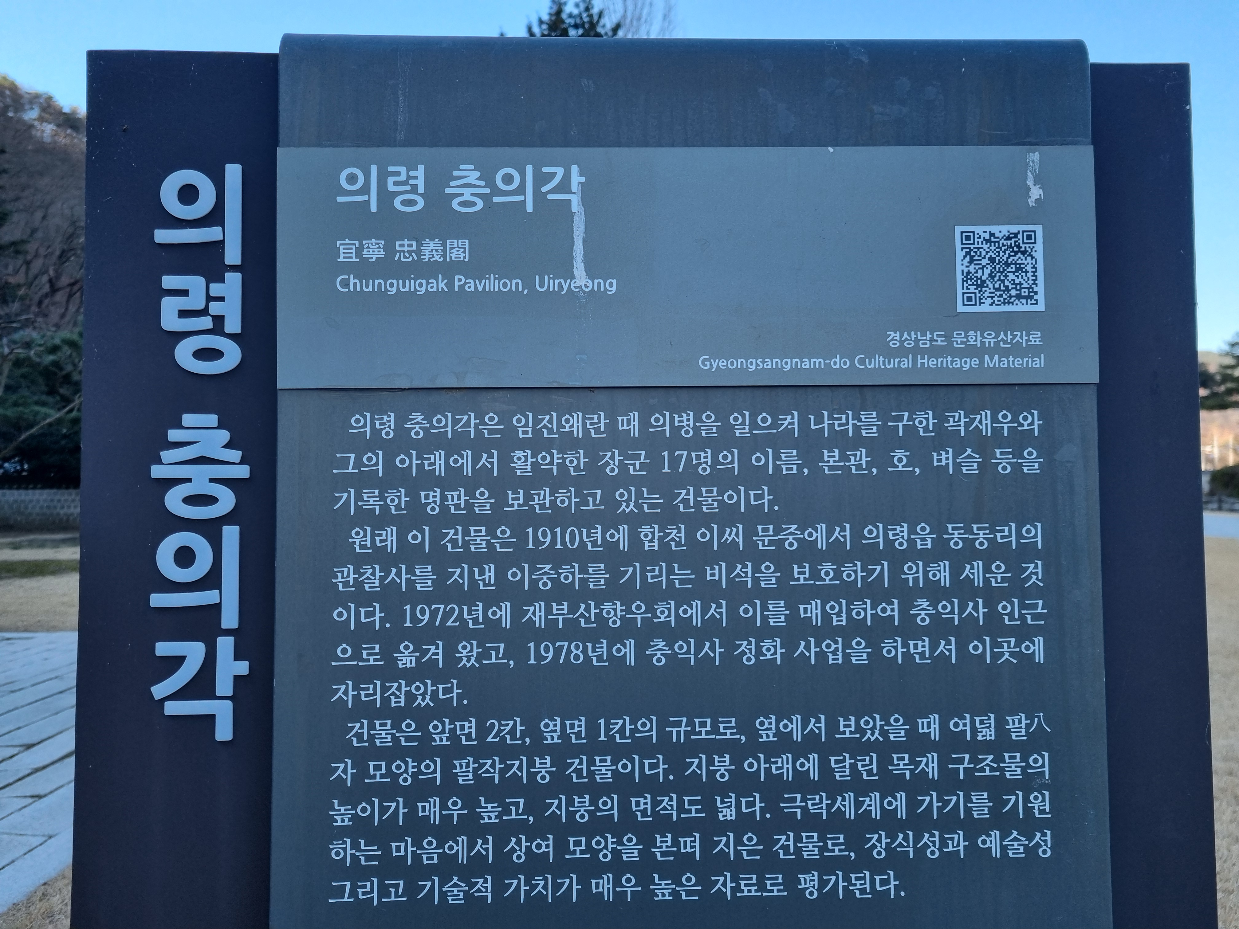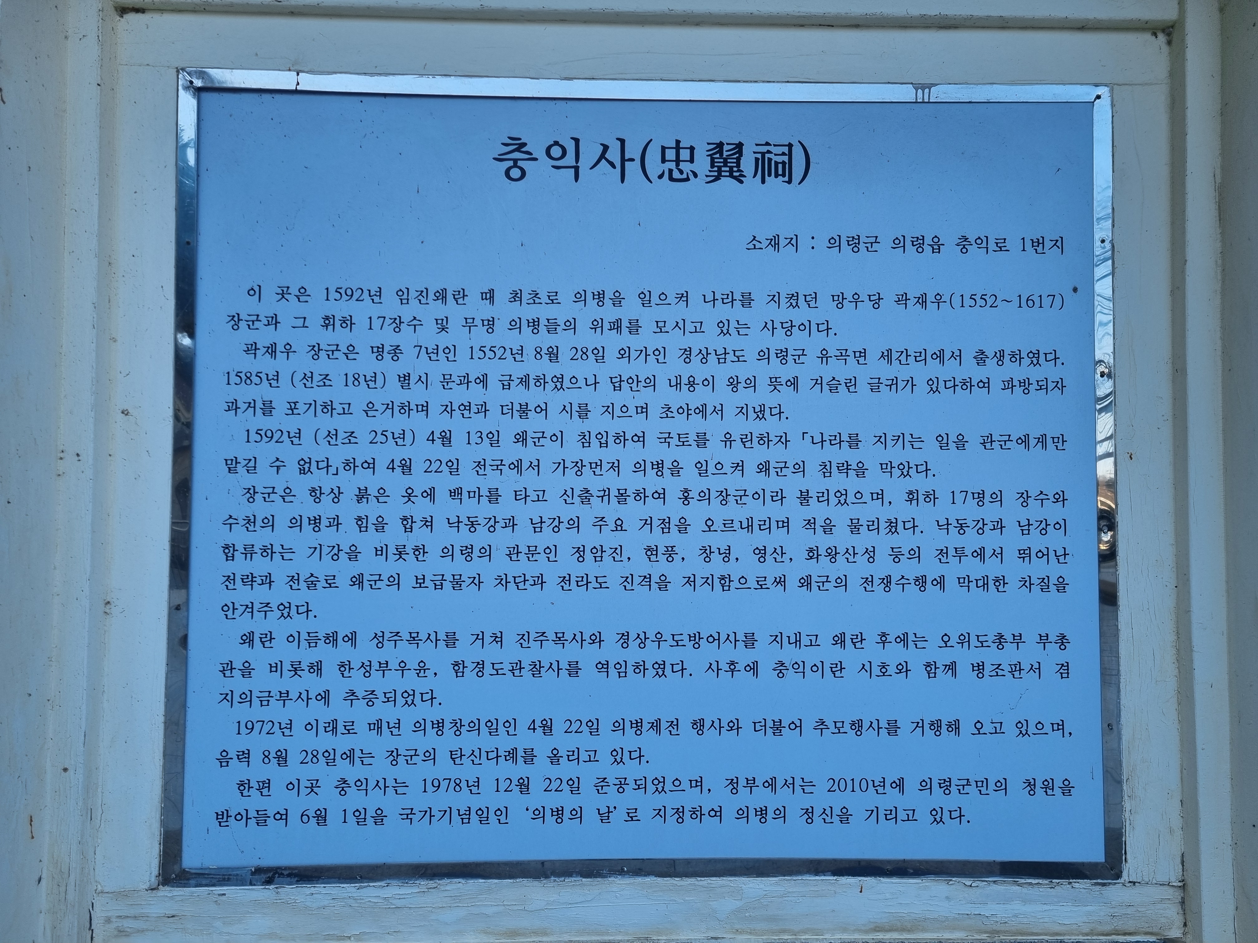 2026년 1월 11일(일) 대전 한밭문화원에서 주관하는 문화탐방에 참여하여 첫번째 답사지로 경남 의령군 의령읍 충익로 1(의령읍 중동리 468)에 있는 충익사와 의병박물관에 다녀왔다. 충익사(忠翼祠)는 임진왜란과 정유재란 때 의병 장군으로 활동한 홍의장군 충익공 곽재우 장군과 휘하의 17인의 장령들의 신위를 모신 사당이다. 의령읍 남산 밑의 의령천 강가에 조성되었으며, 1974년에 준공되었다.