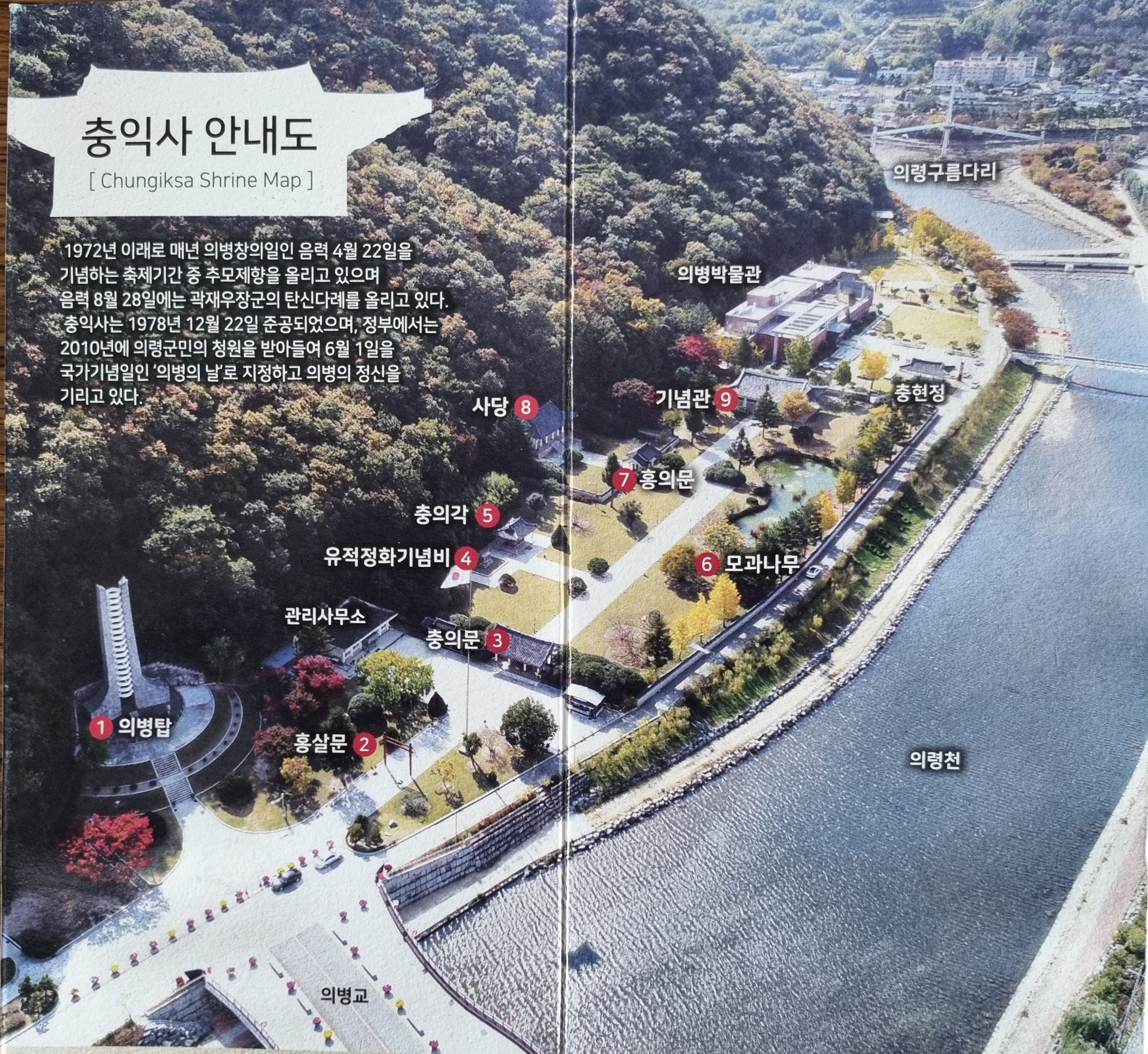 배산임수로 배치된 충익사 앞에는 내삼문 역할을 하는 홍의문(紅衣門)이 충의문과 직각 방향으로 설치되어 있다. 홍의문을 지나 충익사 사당 앞에 모여 분향을 하고 다같이 묵념으로 예를 올렸다. 충익사는 1978년 12월 22일에 준공되었다코 한다. 박정희 대통령 시절인 1970년대 초에 급하게 국가유산들이 복원되거나 건축될 때 그랫듯이 콘크리트 건물로 지어져 있다. 다포식 팔작지붕 형식으로 양쪽 처마가 위로 살짝 올라간 형태로 콘크리트 건물로는 잘 지은 사당이다. 이러한 콘크리트 건물도 우리 근대사의 또 하나의 보존해야할 유산이기도 하다. 의령천변의 제약으로 외삼문과 내삼문 및 사당이 일직선으로 배치되지 못한 점도 특이한 점이다. 외삼문과 내삼문 앞에는 오른쪽 문으로 들어가고 왼쪽 문으로 나오도록 사당 출입 예절을 알리는 안내문이 설치되어 있어서 마음에 쏙들었다. 나름대로 우리의 전통을 이어가는 정성이 보였고, 함께 간 많은 탐방객들이 누구하나 실수하지 않게 가이드하는 역할을 잘 해주어 흐믓했다.