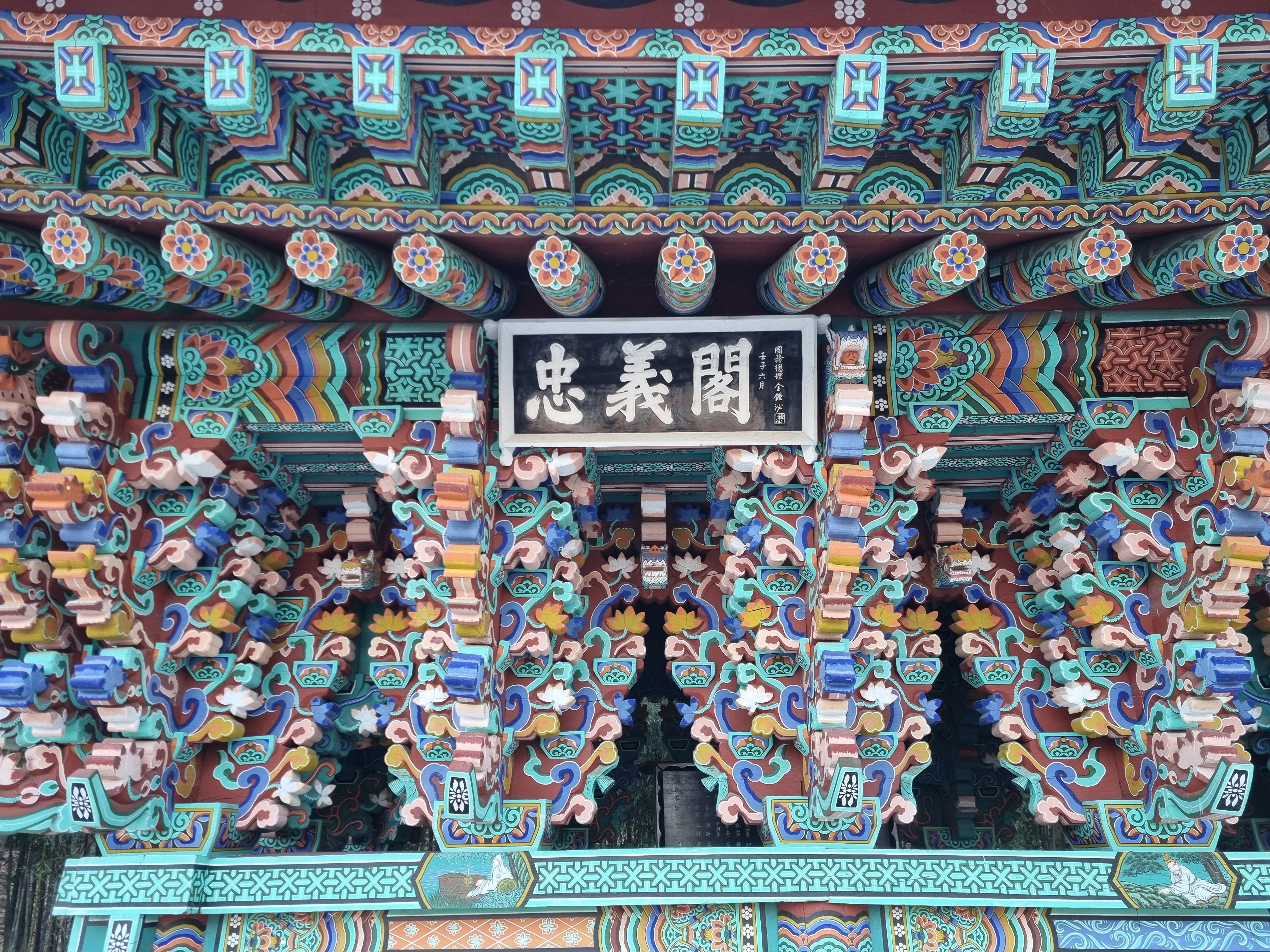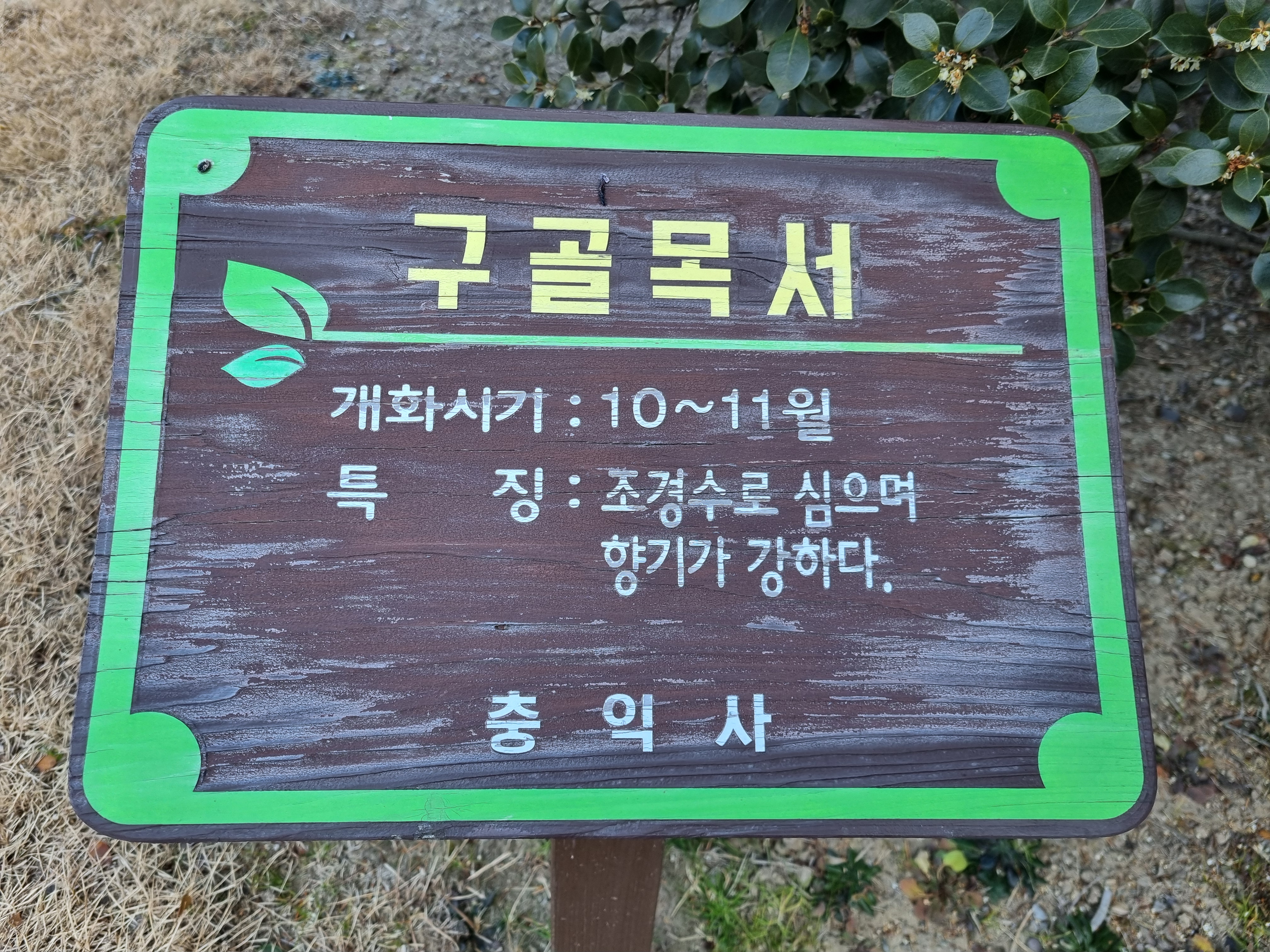 우측에 있는 홍살문을 지나 사당의 외삼문으로 설치된 충의문(忠義門)을 지나면 왼쪽에 충의각이 있다. 충의각은 곽재우 장군과 17장령의 이름과 본관, 호, 증직을 기록한 명판을 보관하는 곳으로 상여처럼 보인다. 화려한 다포식 팔작지붕을 땅에 내려놓은 형태의 목조건물로 다른 곳에서는 보기 힘든 건물 구조다. 어느 한 곳에도 쇠못을 치지 않은 우리나라 전통 목조 건물의 건축양식으로 지어졌다고 한다. 충의각 앞에는 구골목서가 있다. 올해는 무슨 일인지 혹한의 날씨인 요즘에 꽃이 만발해 있었다.