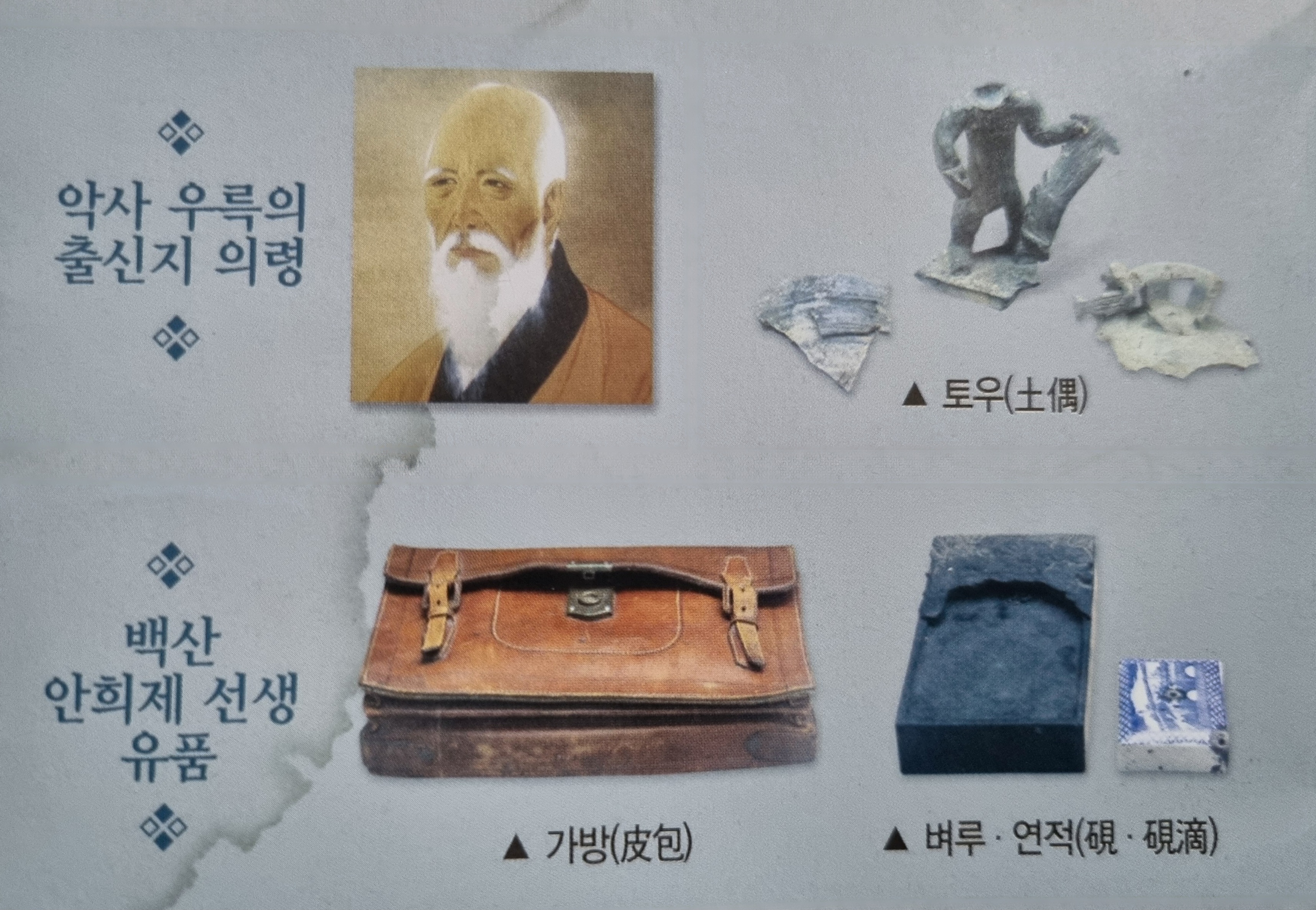 특히 12현금의 가야금을 만든 이곳 의령의 가야 출신 우륵 악사와 의령 출신으로 부산에 백산상회를 창립하여 독립군의 군자금을 대셨던 백산 안희제 선생의 유물도 볼 수 있다. 의병유물전시실에는 곽재우 장군의 유물들이 전시되어 있고, 솥바위가 있는 정암진에서의 전투 장면을 시현한 디오라마도 볼 수 있다.