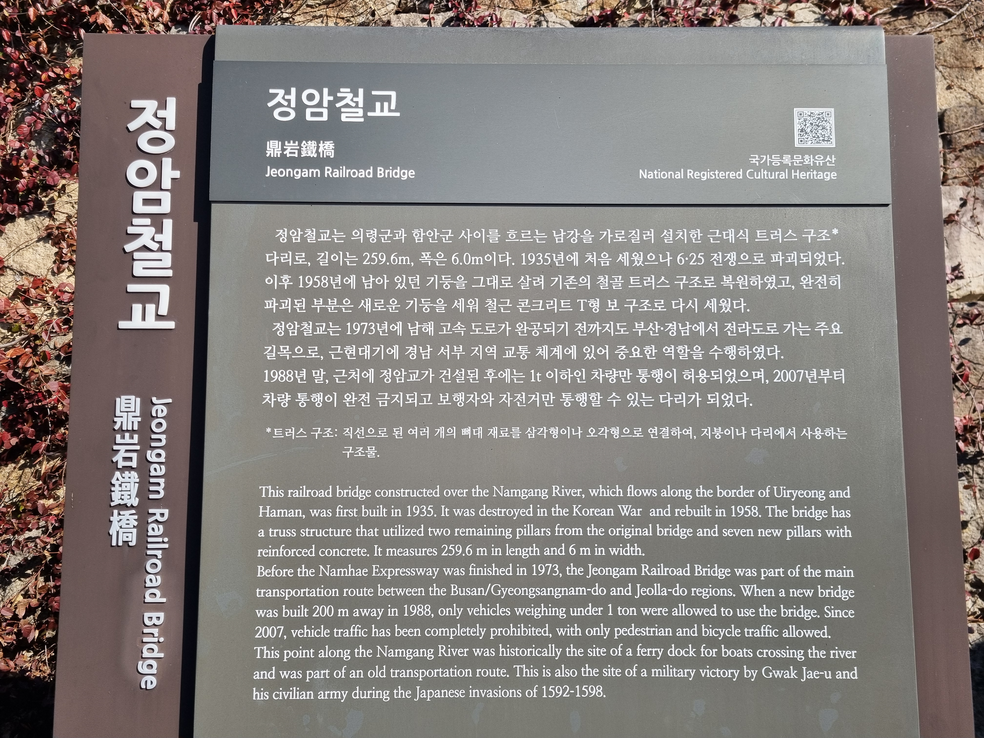 국가유산청의 국가유산포털의 소개 자료를 인용하면, 정암철교는 의령군과 함안군 사이를 흐르는 남강을 가로질러 설치한 근대식 트러스 구조 다리로, 길이 259.6m, 폭 6.0m이다. 1935년에 처음 세웠으나 6.25전쟁으로 파괴되었다. 이후 1958년에 남아있던 기둥을 그대로 살려 기존의 철골 트러스 구조로 복원하였고, 완전히 파괴된 부분은 새로운 기둥을 세워 철근 콘크리트 T형 보 구조로 다시 세웠다. 정암철교는 1973년에 남해 고속 도로가 완공되기 전까지는 부산·경남에서 전라도로 가는 주요 길목으로, 근현대기에 경남 서부 지역 교통 체계에 있어 중요한 역할을 수행하였다. 1988년 말, 근처에 정암교가 건설된 후에는 1t 이하인 차량만 통행이 허용되었고, 2007년부터 차량통행이 완전 금지되고 보행자와 자전거만 통행할 수 있는 다리가 되었다.(출처: 국가유산포털 – 정암철교).