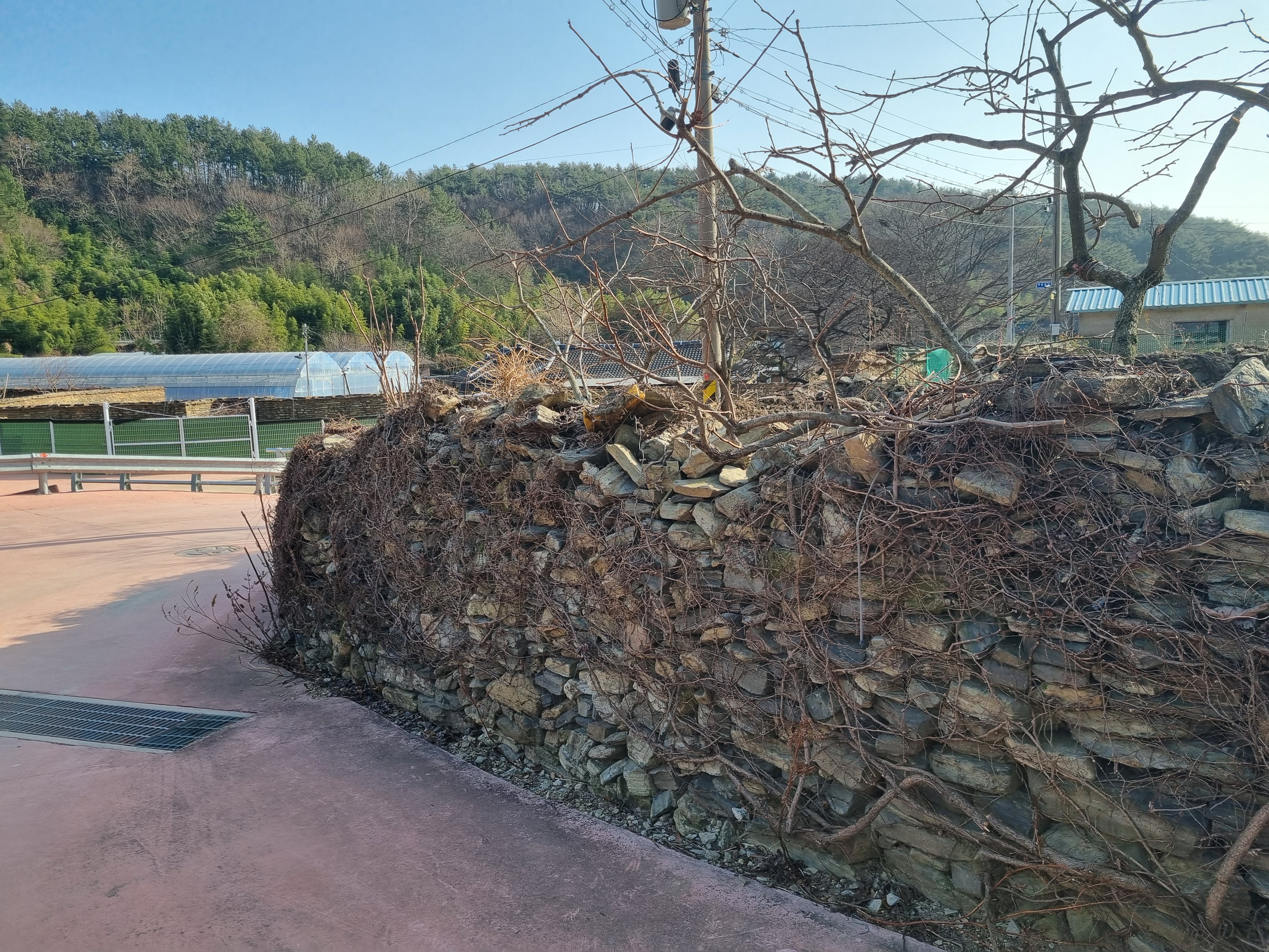 수태산 쪽에서 학동마을로 들어오다 보면, 집집마다 돌담이 둘러쳐져 있는 것을 볼 수 있다. 어떤 집은 점판암 개석인 납작돌로만 켭켭이 쌓아 올려 담장을 만든 집도 있고, 종가집 같은 집은 점판암 개석과 흙을 차례로 층층히 쌓은 후 맨 위에 큰 납작돌을 올려놓은 집도 있다. 이 많은 돌이 어디서 나왔을까 궁금하여 동네 아주머니께 여쭤보니, 이 동네에서도 많은 납작돌이 나왔고, 뒷산에 올라가면 지금도 조금만 흙을 파면 이런 납작돌이 무척 많다고 한다. 돌담 위로는 능소화를 늘어뜨려 여름에는 멋진 꽃을 볼 수 있다고 한다.