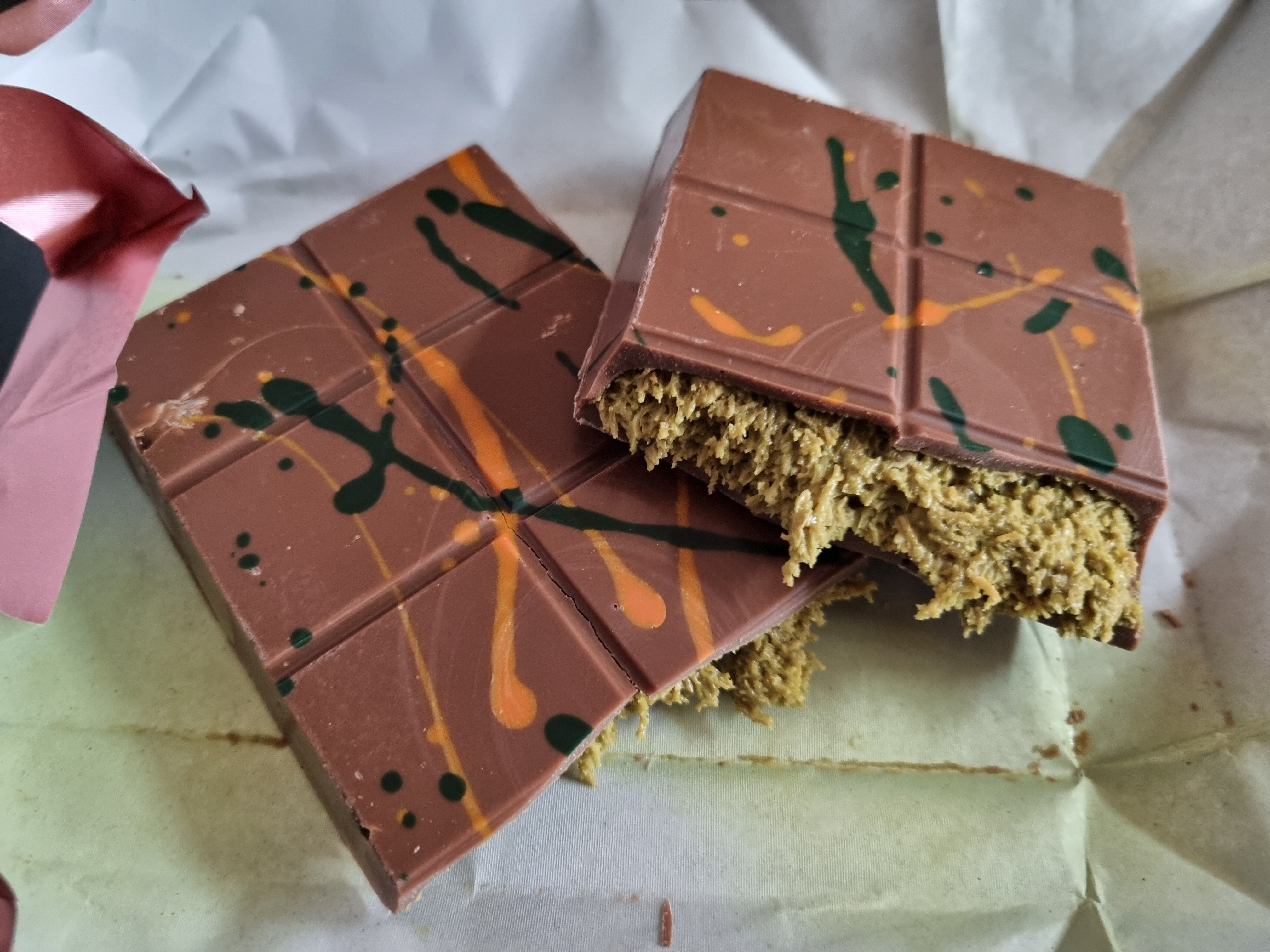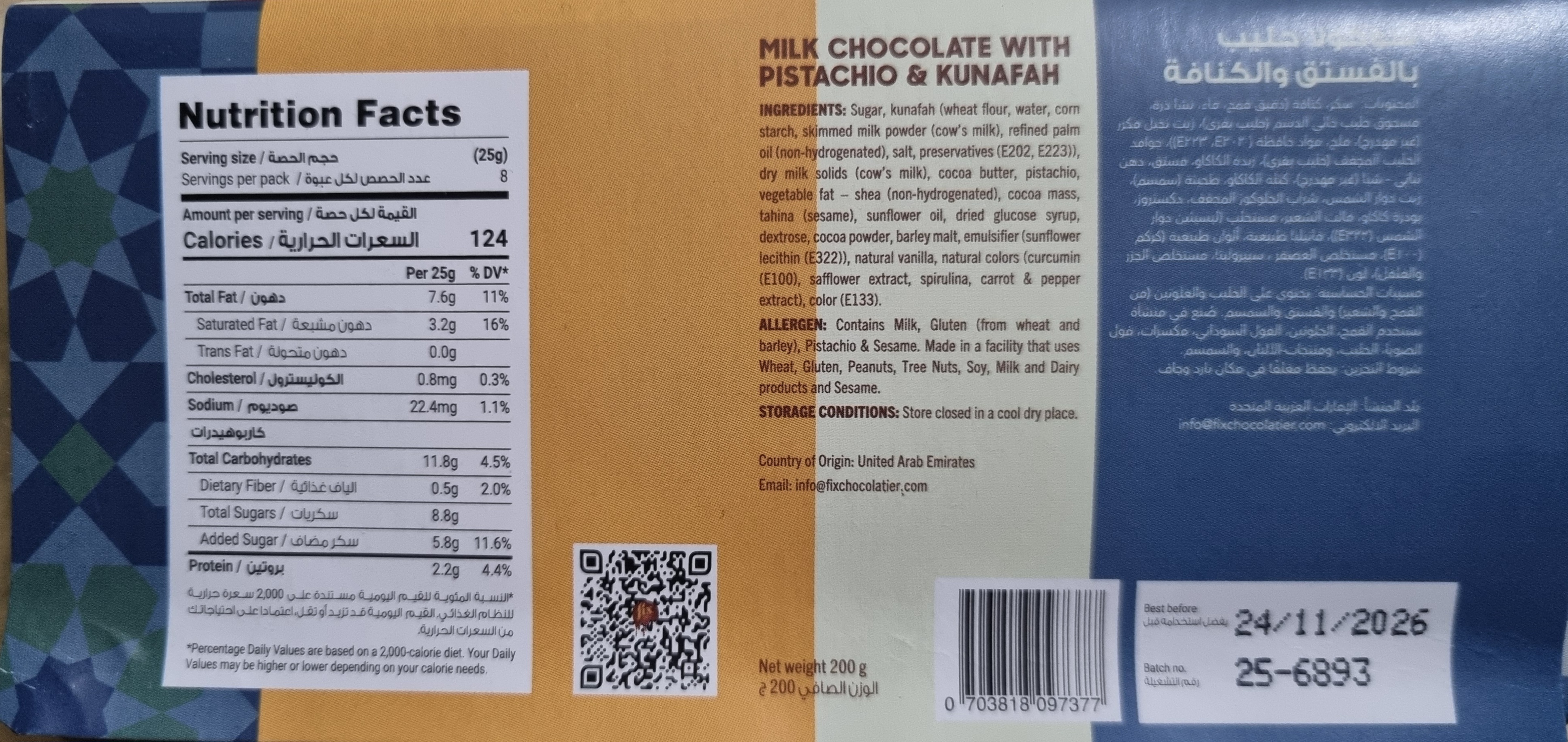 2026년 2월 17일 설날에 두바이 픽스 초콜릿(Dubai Fix Chocolate)을 먹어 보았다. 며느리가 아랍에미리트(UAE, The United Arab Emirates) 두바이에 다녀오면서 두바이 현지에서 사온 두바이 픽스 초콜릿을 가져와서, 덕분에 이색적인 초콜릿을 맛 볼 수 있었다. 아랍에미리트 두바이에서 시작된 고급 초콜릿 브랜드로, 밀크 초코릿 안에 초록색의 피스타치오(Pistachio)가 들어있고 식감이 모래를 씹는 것과 비슷한 초콜릿이다. 박스 옆에는 'Can't Get Knafeh of It' 라는 글씨가 쓰여져 있는 데, 이 초콜릿의 맛을 표현하는 말로 '카다이프가 들어간 쿠나파에 피스타치오와 참깨 소스인 타히니가 들어간 맛'이라는 뜻이란다. 이 제품이 가장 유명하다고 한다.