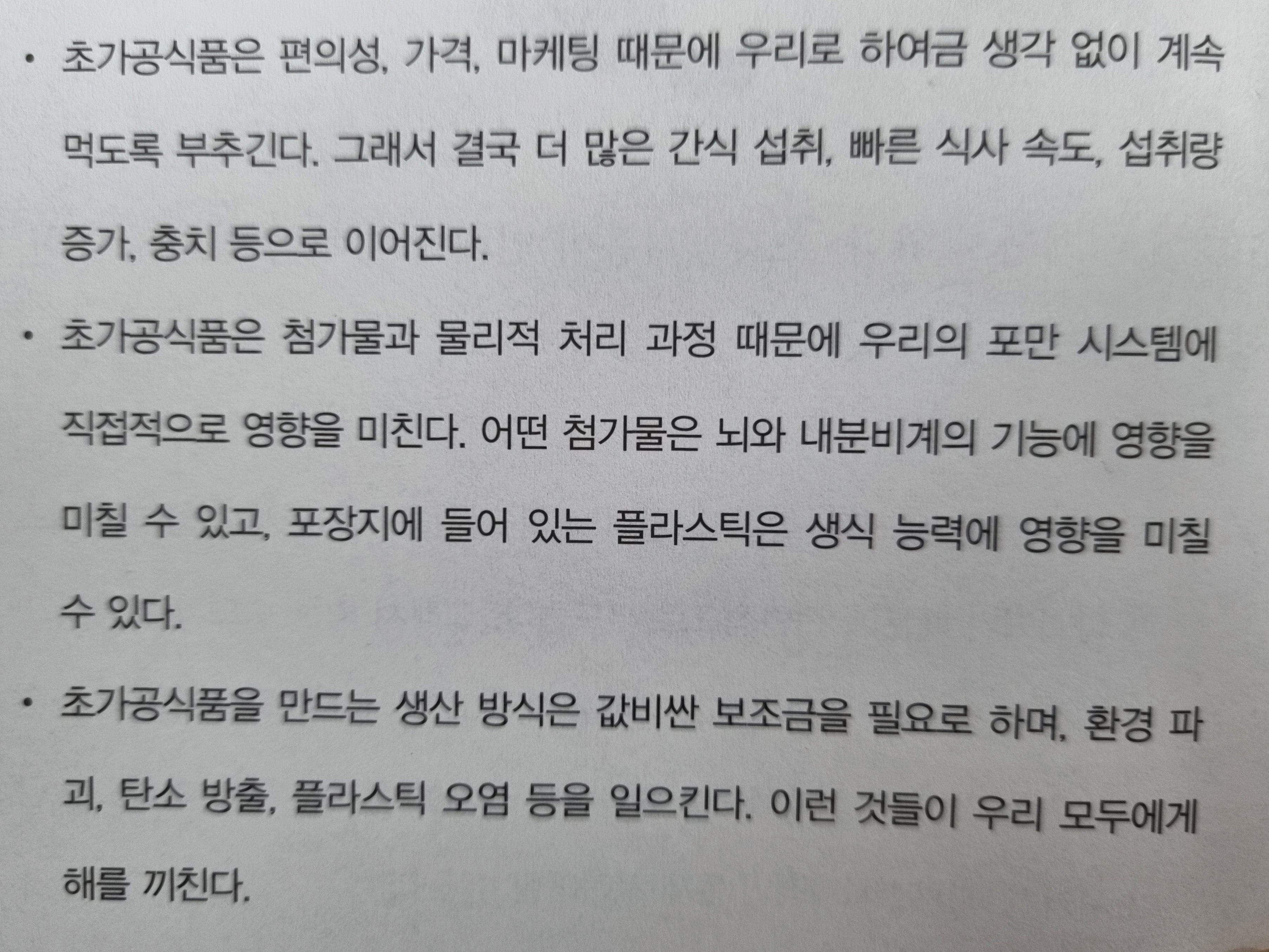 세계적인 식품회사들과 제품명 등을 실명 그대로 노출하면서 초가공식품의 폐해를 지적하고 있는 저자의 용기에 박수를 보낸다. 이 책을 읽으며 점심으로 먹은 컵라면과 비스켓 등의 성분표를 보니, 각종 인산염과 글리세린 화합물이 들어 있었다. 더구나 유화제로는 어떤 성분이 들어갔는지 조차 언급이 없다. 다양한 화학제품이 들어 있는 음식을 먹고 있었다.