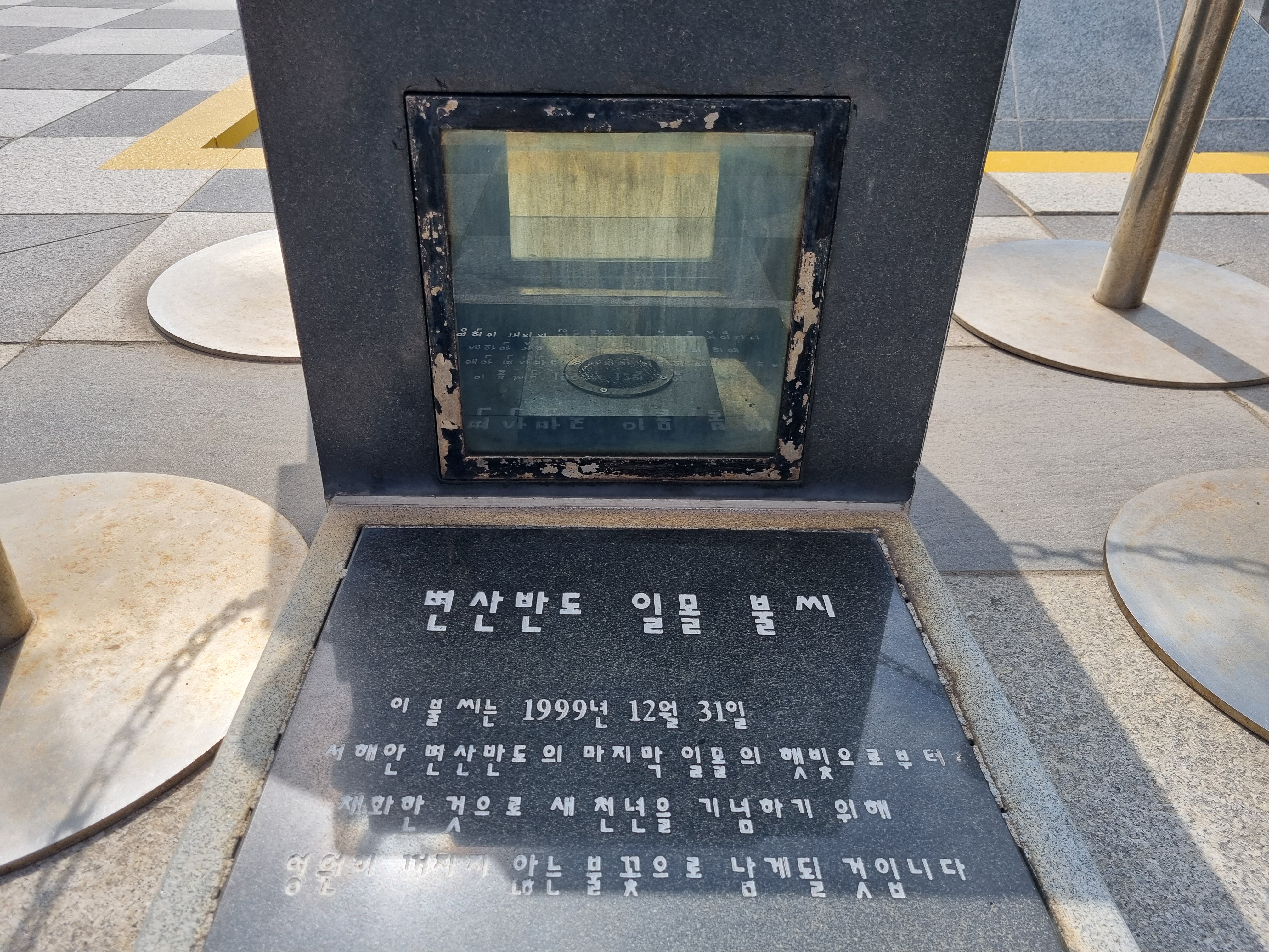 포항시 문화관광해설사의 안내로 호미곶 해맞이광장에 대해 설명을 들으며 둘러볼 수 있었다. 해맞이광장에는 새천년 한민족 해맞이축전 개최장소로 만여평의 부지에 기념조형물, 성화대, 불씨함, 연오랑세오녀상, 공연장 등이 있다. 성화대 앞에는 세 개의 불씨함이 설치되어 있다. 1999년 12월 31일에 변산반도에서 20세기의 마지막 햇빛으로 채화한 불씨가 왼쪽에 있고, 중앙에는 2000년 1월 1일에 이곳 호미곶에서 새천년 첫 햇빛으로 채화한 불씨가 설치되어 있다. 오른쪽에는 독도에서 채화한 불씨와 날짜 변경 선이 통과하는 남태평양 피지섬에서 채화한 불씨를 합화(合火) 한 불씨가 있다.