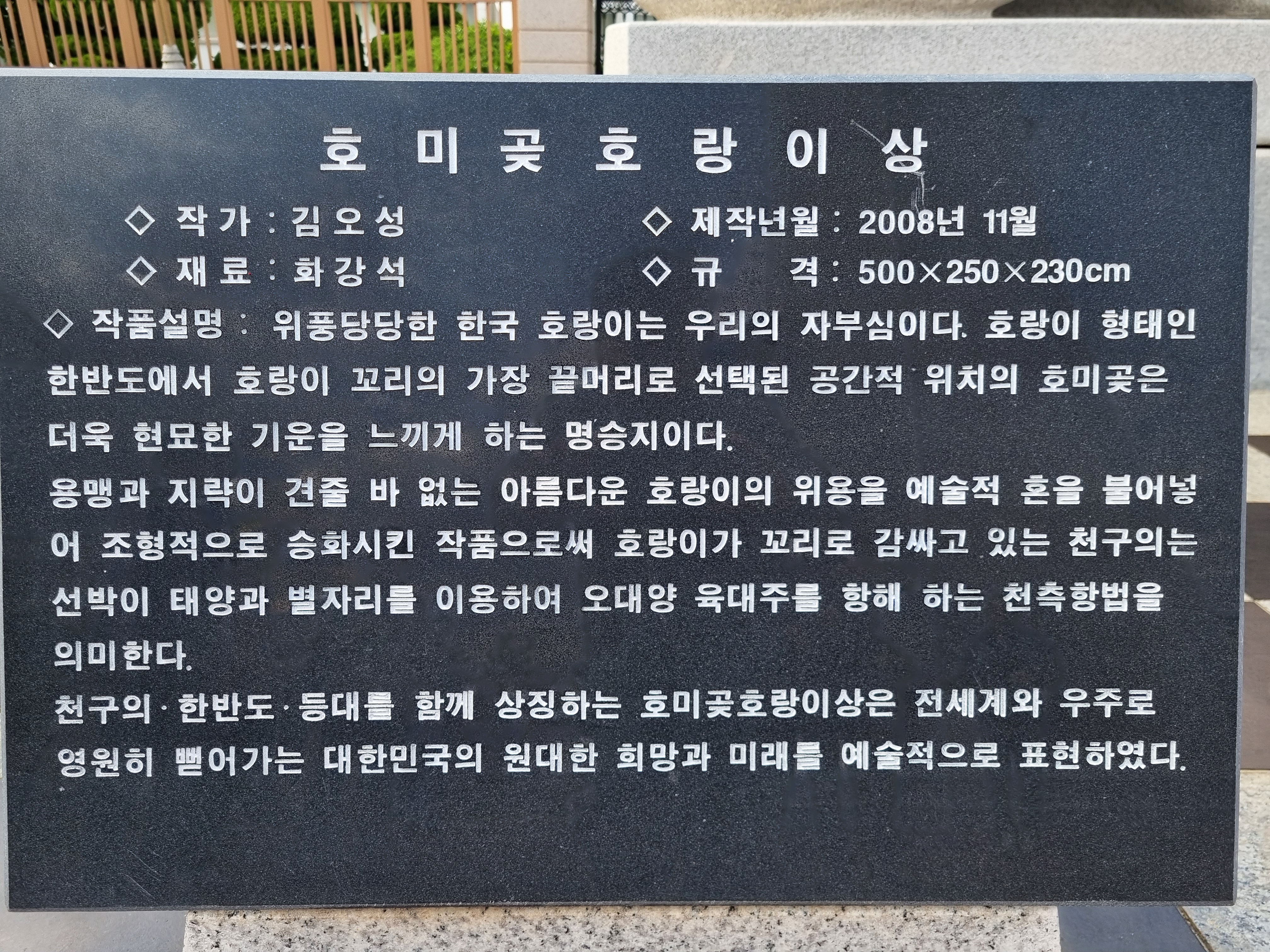 2025년 5월 11일에 한밭문회원의 문화탐방에 참여하여 세 번째 답사지로 경북 포항시 남구 호미곶면 해맞이로 150번길 20(호미곶면 대보리)에 있는 호미곶 해맞이광장에 다녀왔다. 호랑이를 닮은 한반도 지형의 꼬리에 해당하는 호미곶(虎尾串)은 장기반도의 끝이다. 북쪽은 영일만이고 동쪽으로는 끝없이 펼쳐진 푸른 동해바다를 바라보며 일출을 감상하기에 좋아서 매년 해맞이 명소로 유명하다.