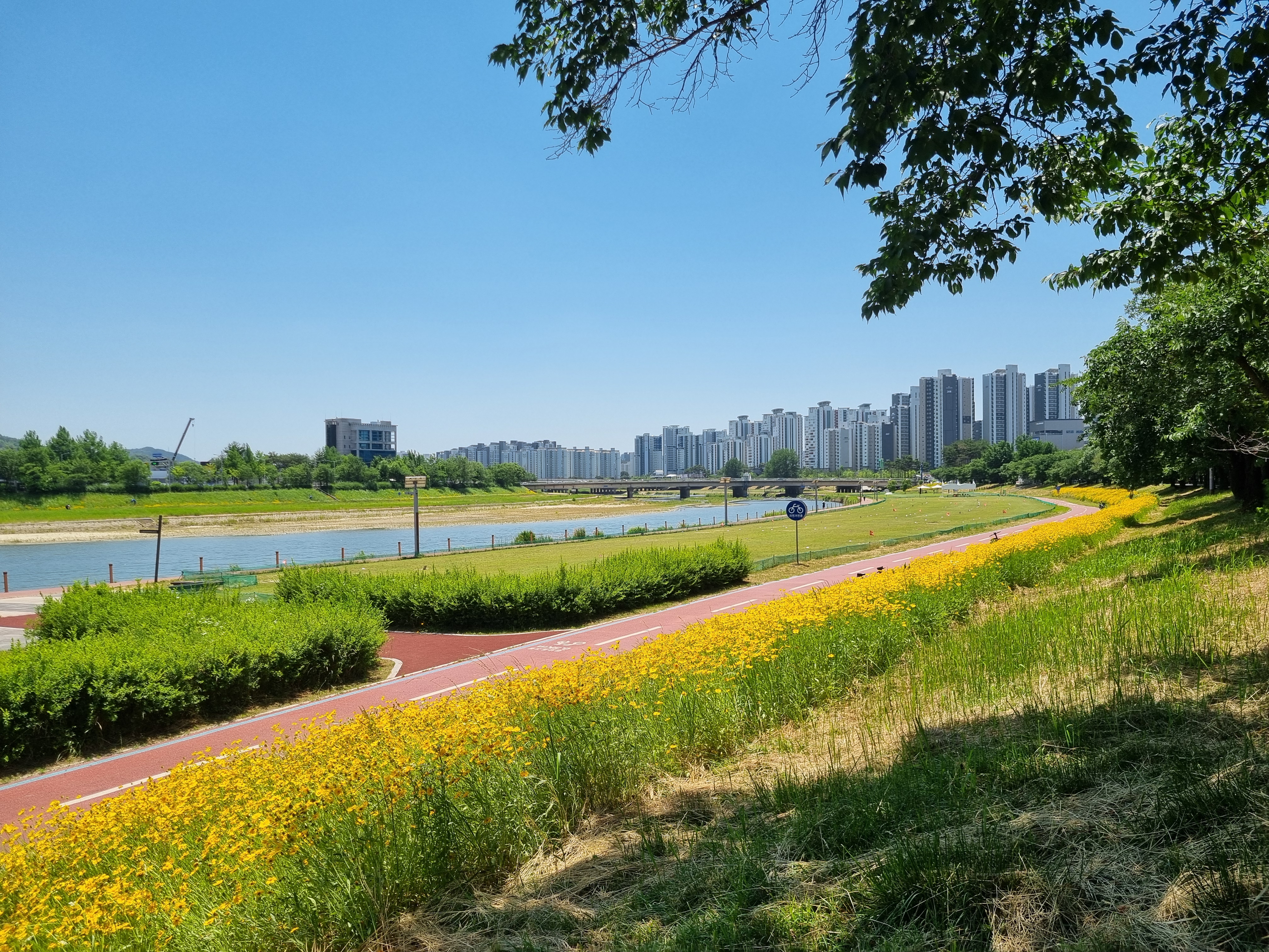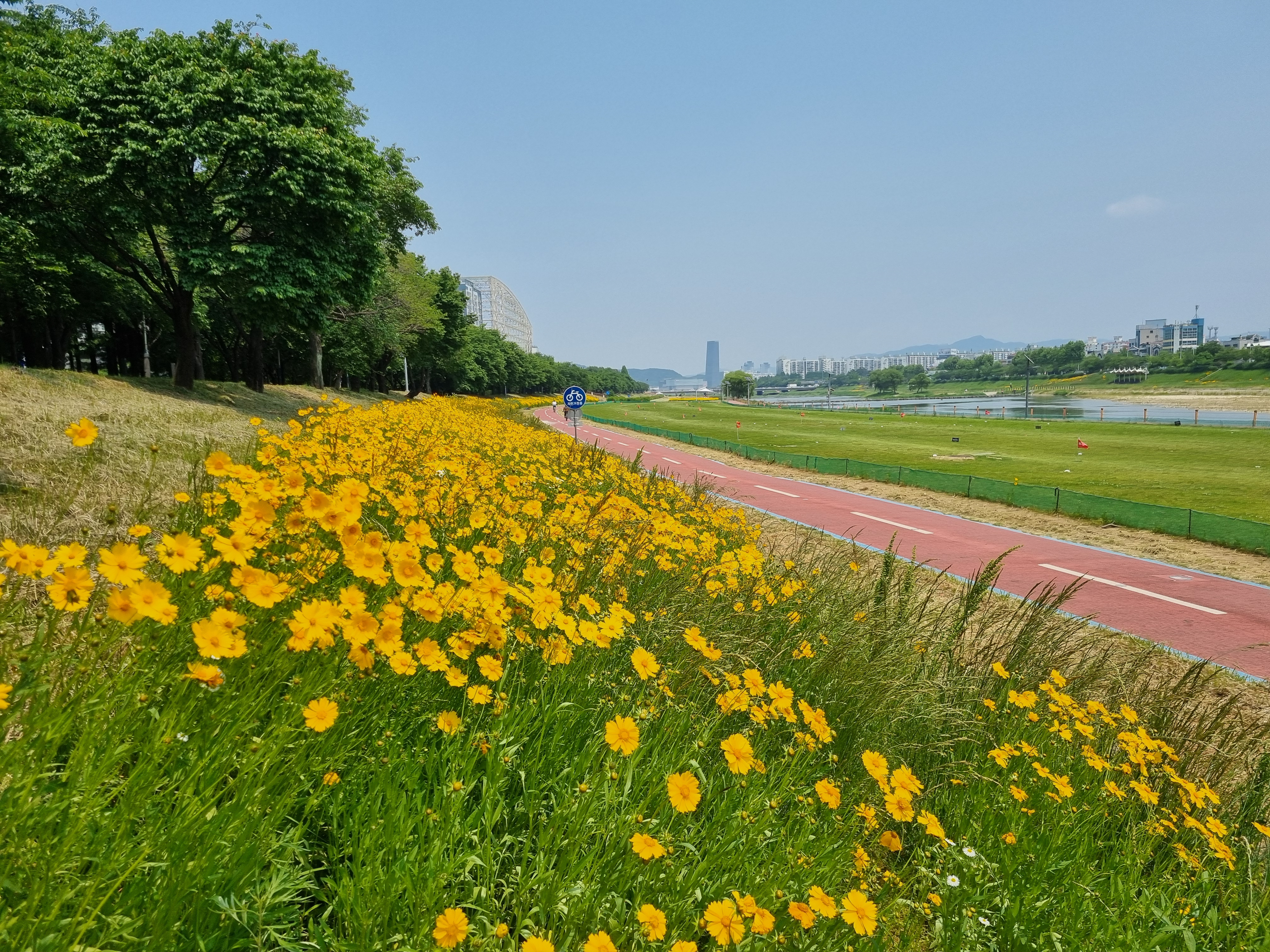 2025년 5월 28일 대전광역시 유성구 갑천변에 심어놓은 금계국이 활짝 피었다. 노란색 띠가 갑천변을 두르고 있다.