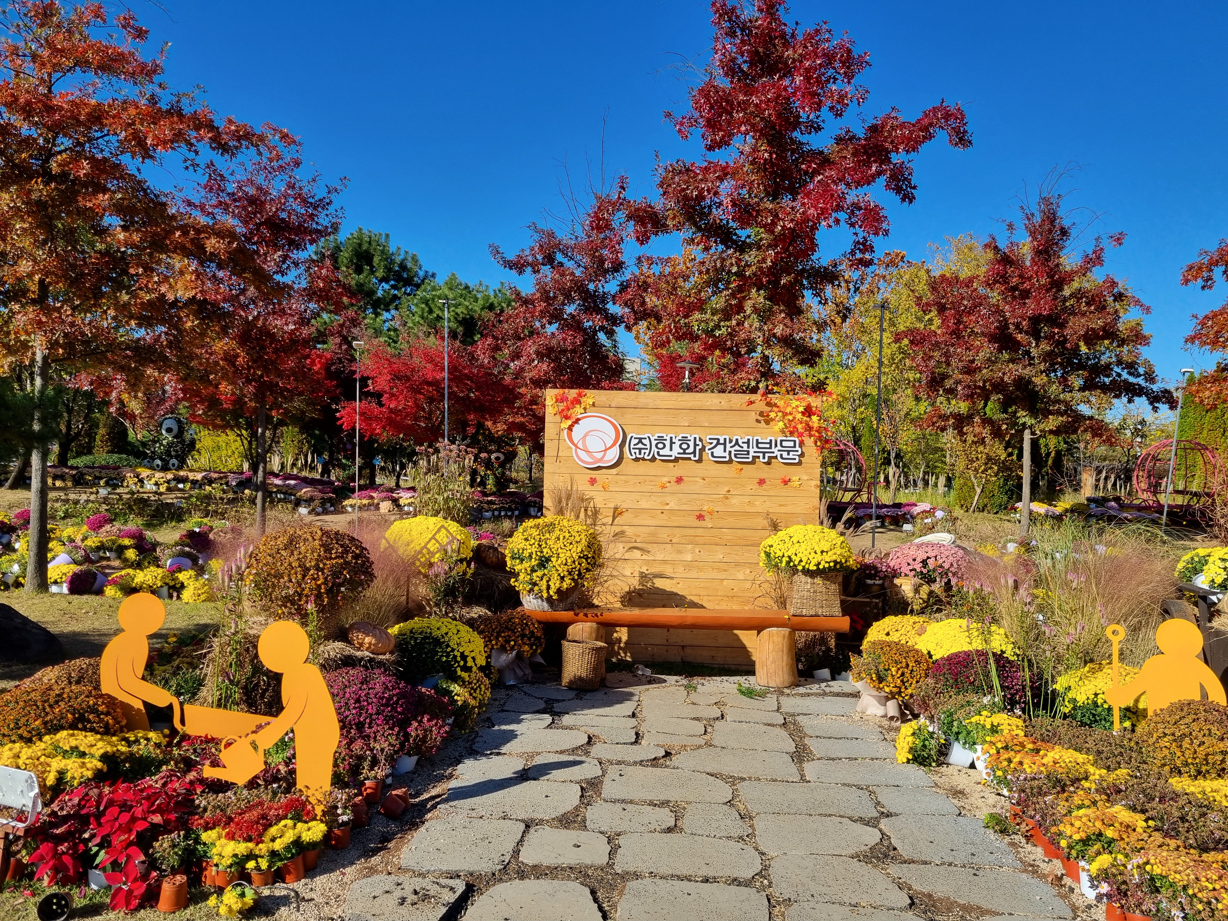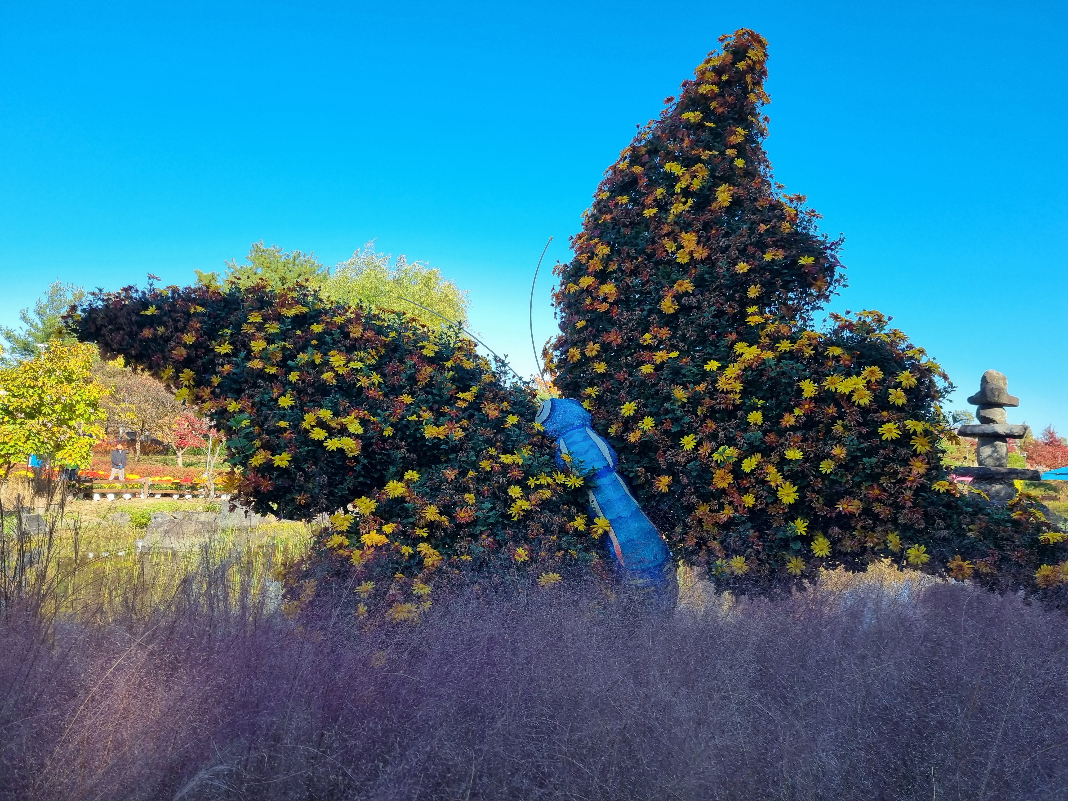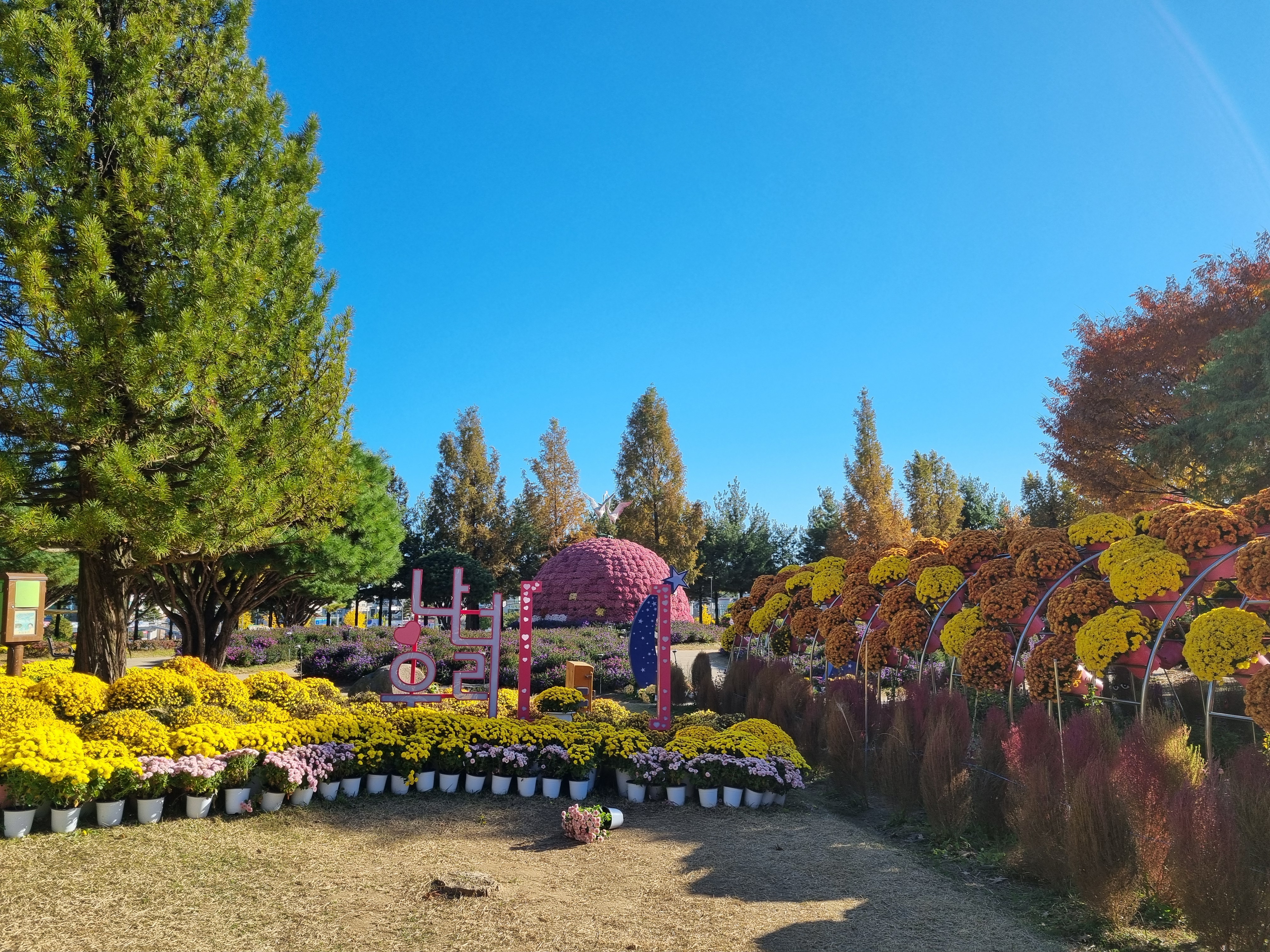 국화축제는 어제 끝났고, 오늘은 벌써 유성구청에서 시설물들과 핑크뮬리 등을 치우고 있었다. 그래도 다행히 많은 국화들이 아직도 한창이고, 핀참나무와 단풍나무 등이 붉게 물들고 있어서 늦은 방문객을 실망시키지 않았다.