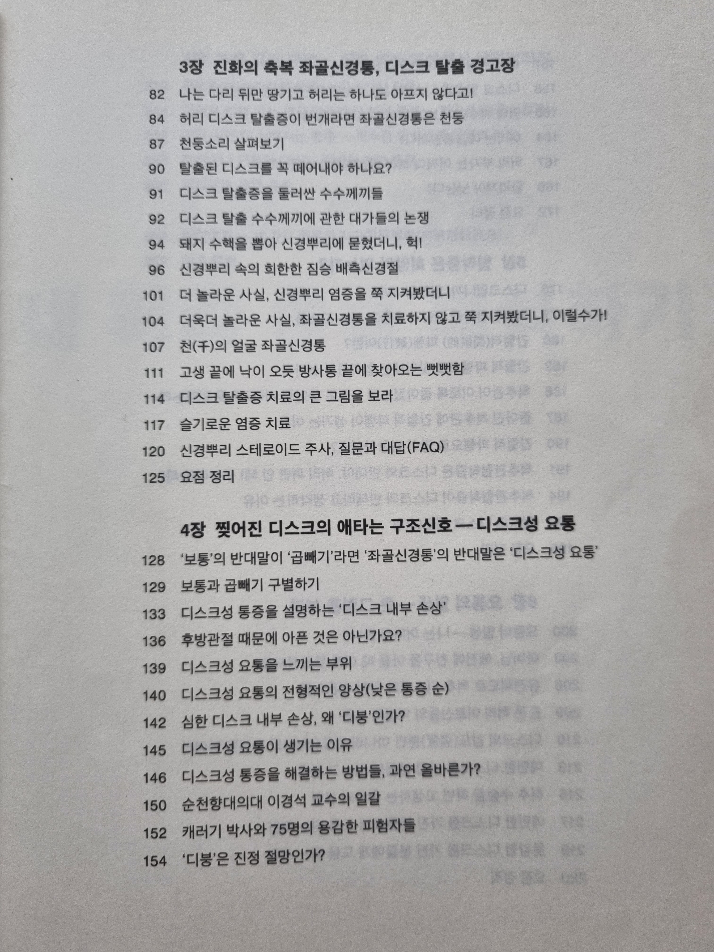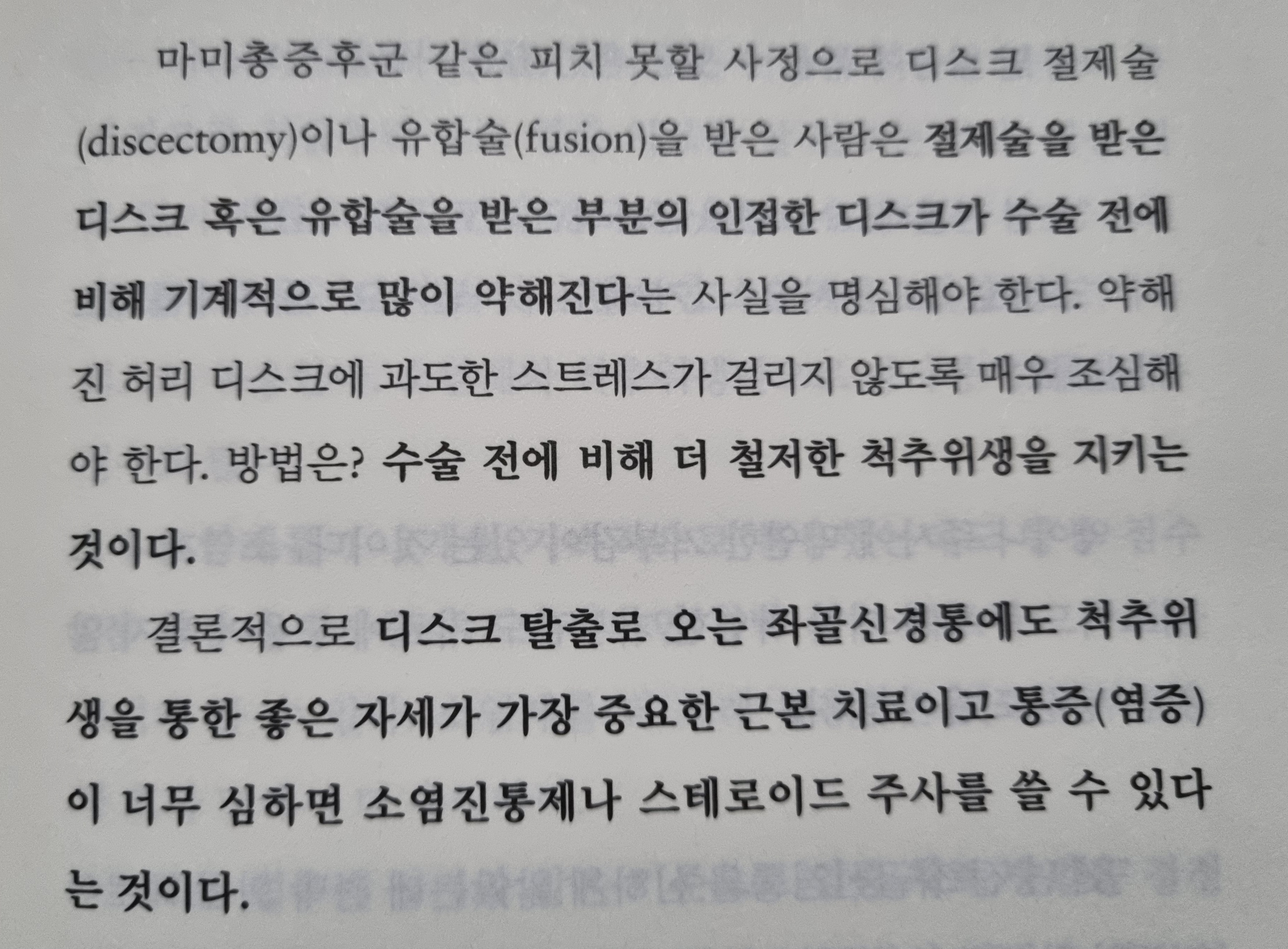 2025년 8월에 허리 때문에 고생할 때 우연히 유튜브를 보다가 서울대학교 의과대학 재활의학과 교수이신 정선근 교수의 『백년허리』를 읽었다. 허리 통증과 관련하여 인터넷을 서핑해 보면, 크게 두 가지 해법이 회자하고 있음을 알 수 있다. 협착증으로 고생할 때 황색인대를 제거하는 등 적극적인 수술법을 권하는 의사분들이 있고, 정선근 교수처럼 자연치유법을 권하는 의사분들이 있음을 알 수 있다. 요즘은 척추의 추간판(디스크)을 제거하고 허리를 고정하는 유합술 수술 같은 부작용이 많은 수술법을 권하는 의사는 없는 것 같다. 당연히 나는 정선근 교수의 의견에 동의하며 자연치유를 기대하고 있다.